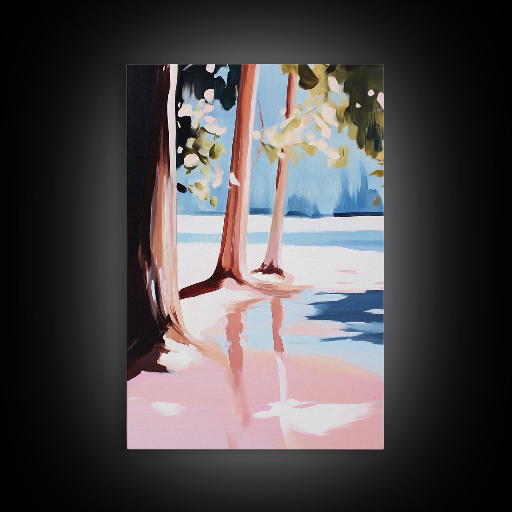 Sunset Reflection, Tranquil Beach, Serene Landscape, Ocean Serenity, Pink Skies, Relaxing Vibes, Framed Canvas Print, Living Room