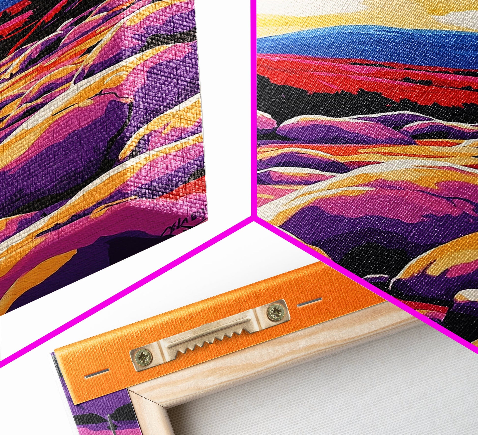 Hello and thank you for taking the time to view our modern high quality giclée artwork! We offer both posters and stretched canvas prints. Our posters are printed on Ultra Matte 60 lb / 230 GSM high quality photo paper, with a thickness of 10 mil. Our canvases are printed on museum grade 350 GSM canvas material with ECO friendly archival grade ink, then hand stretched and stapled over premium, FSC certified and shrink resistant frames. Designed and built to last a lifetime.