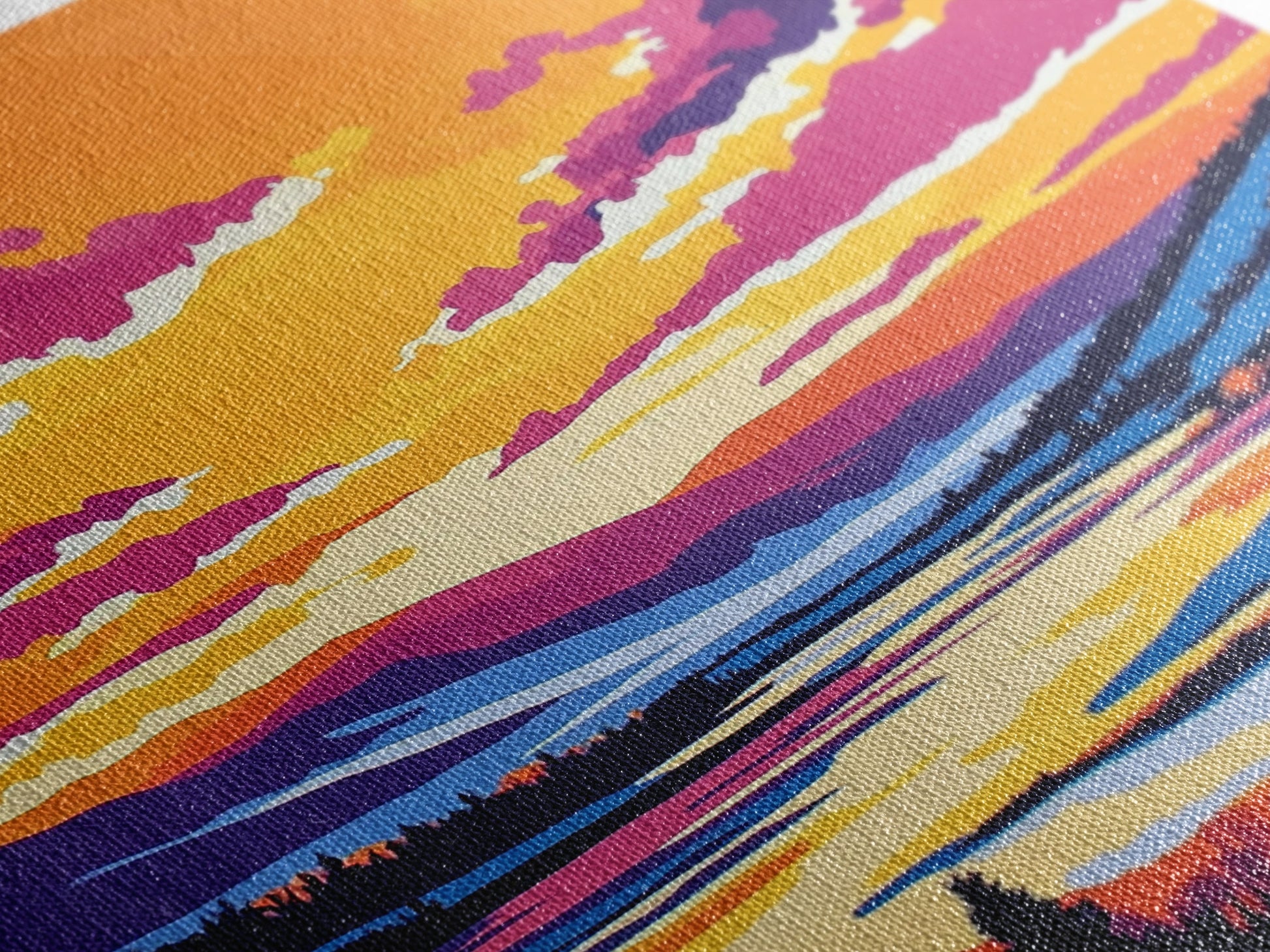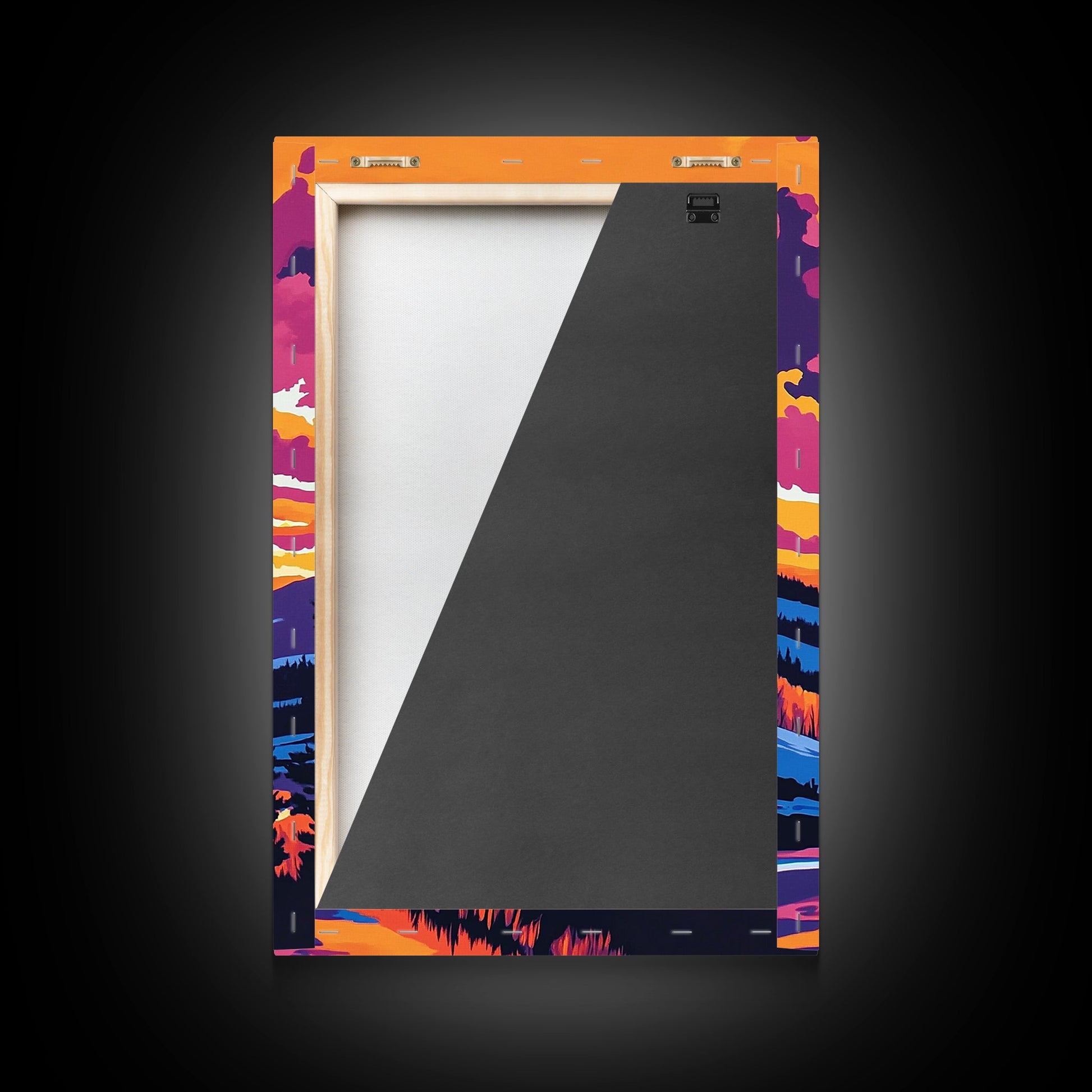 Sunset Valley, Reflection, Framed Canvas Print, Mountain River Art, Vibrant Landscape, Living Room Wall Art, Rustic Home Decor
