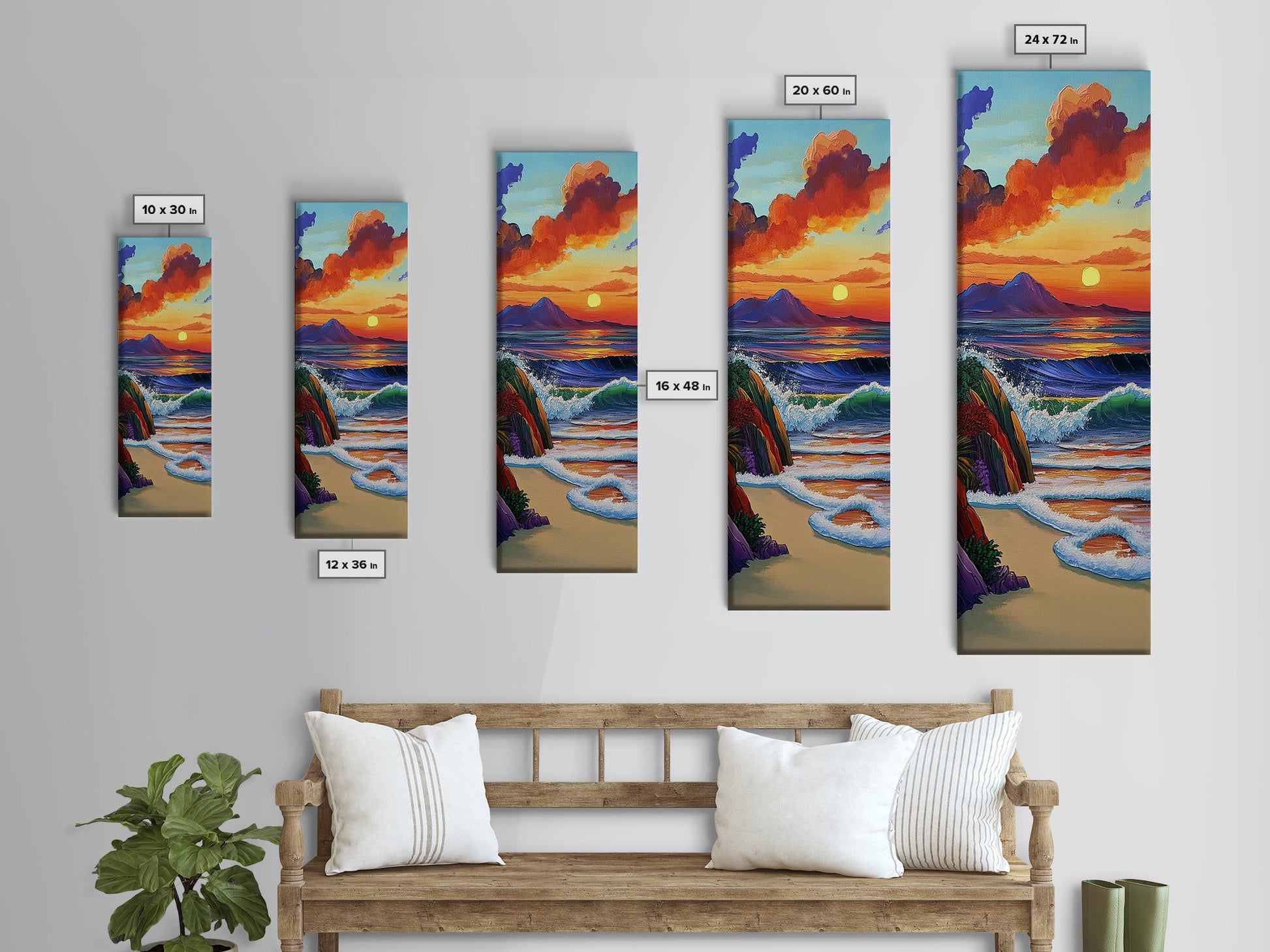Sunset Waves, Shore, Coastal Framed Canvas Print beach sunset wall art, vibrant ocean wave decor, tropical boho art, iving room art