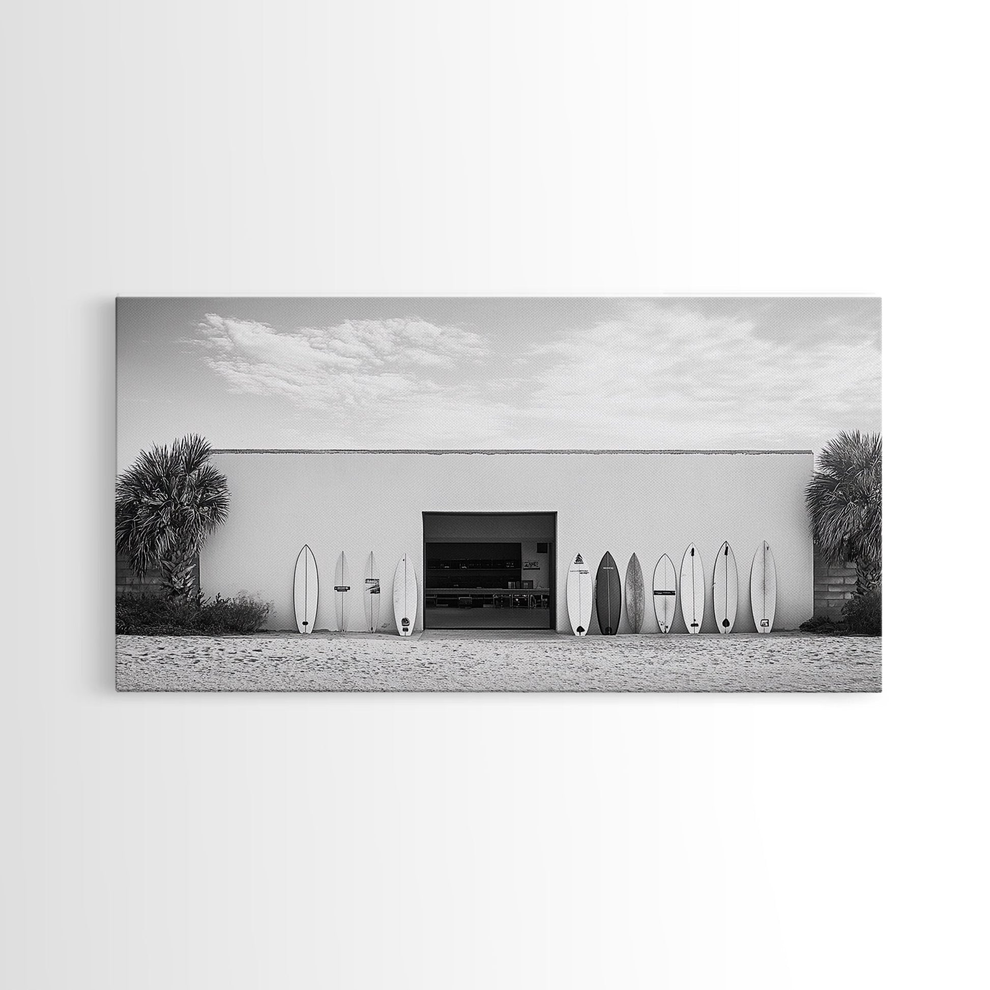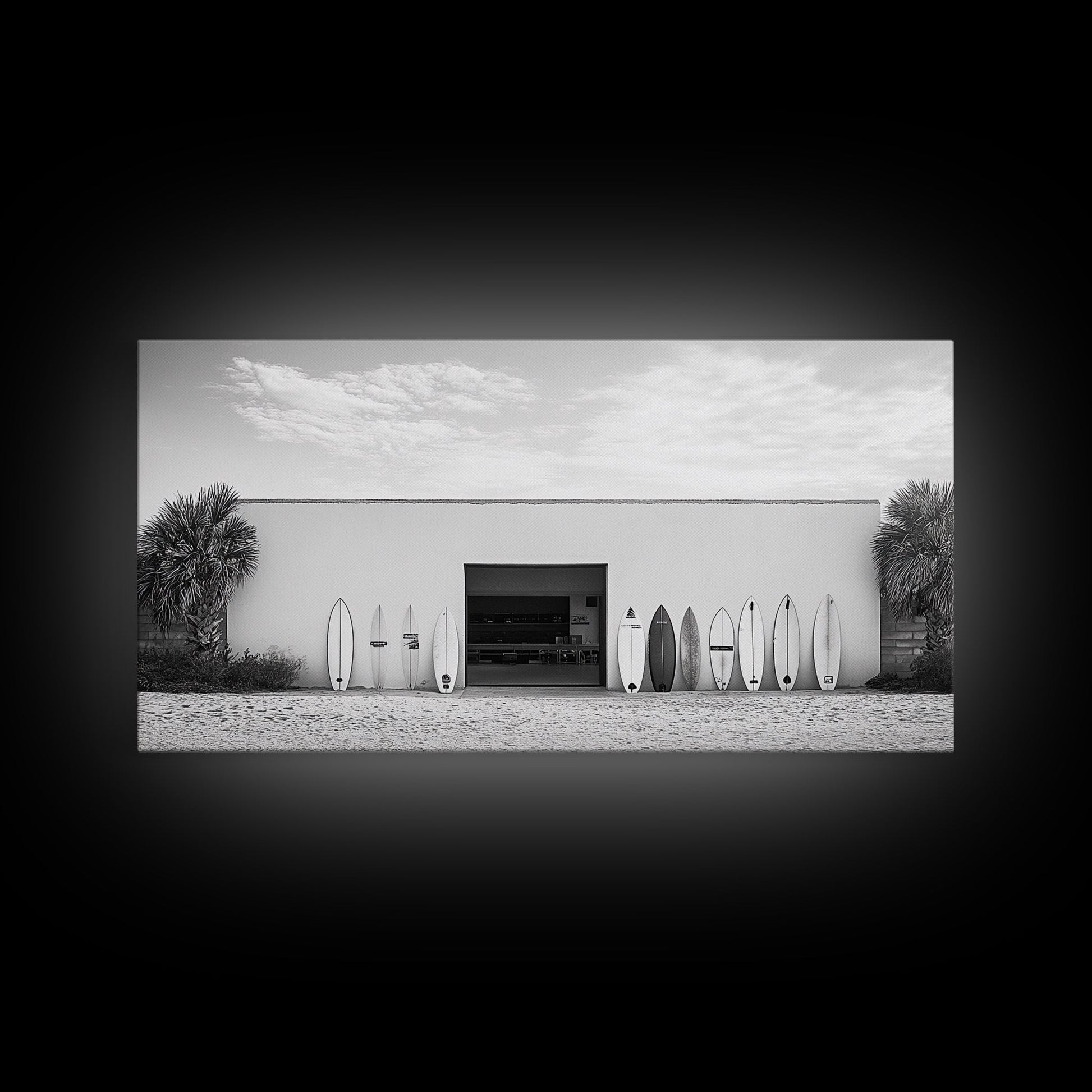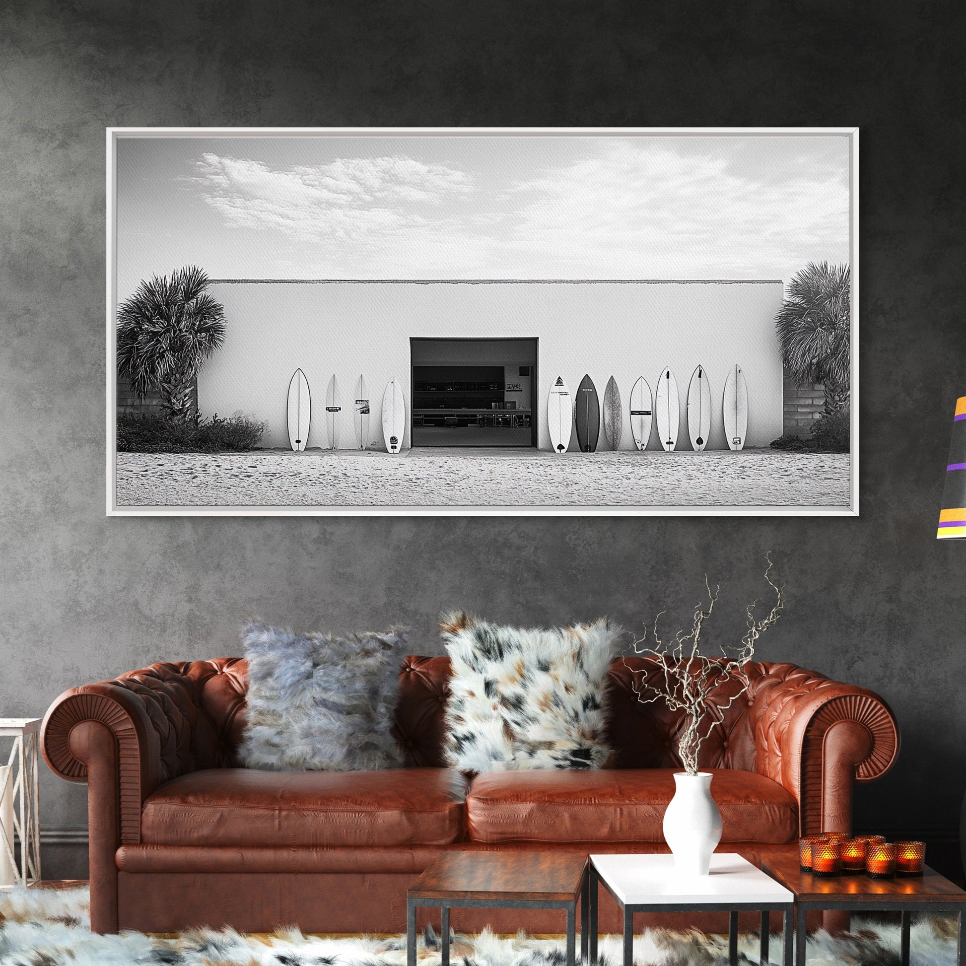 Surfboards, Beach Garage, Modern Coastal, Ocean Style, Framed Canvas Print, surf shack decor, teen room wall art, minimalist beach art
