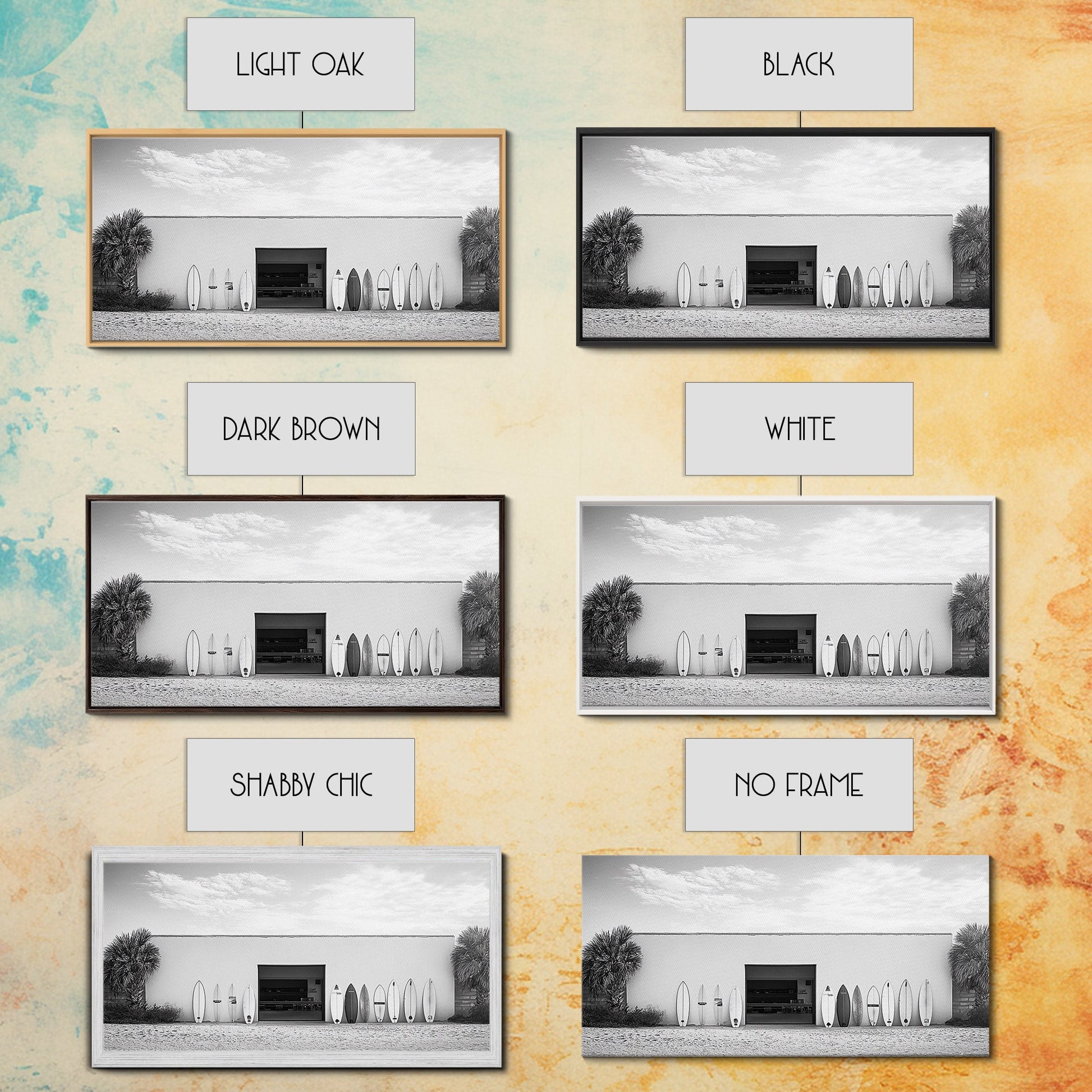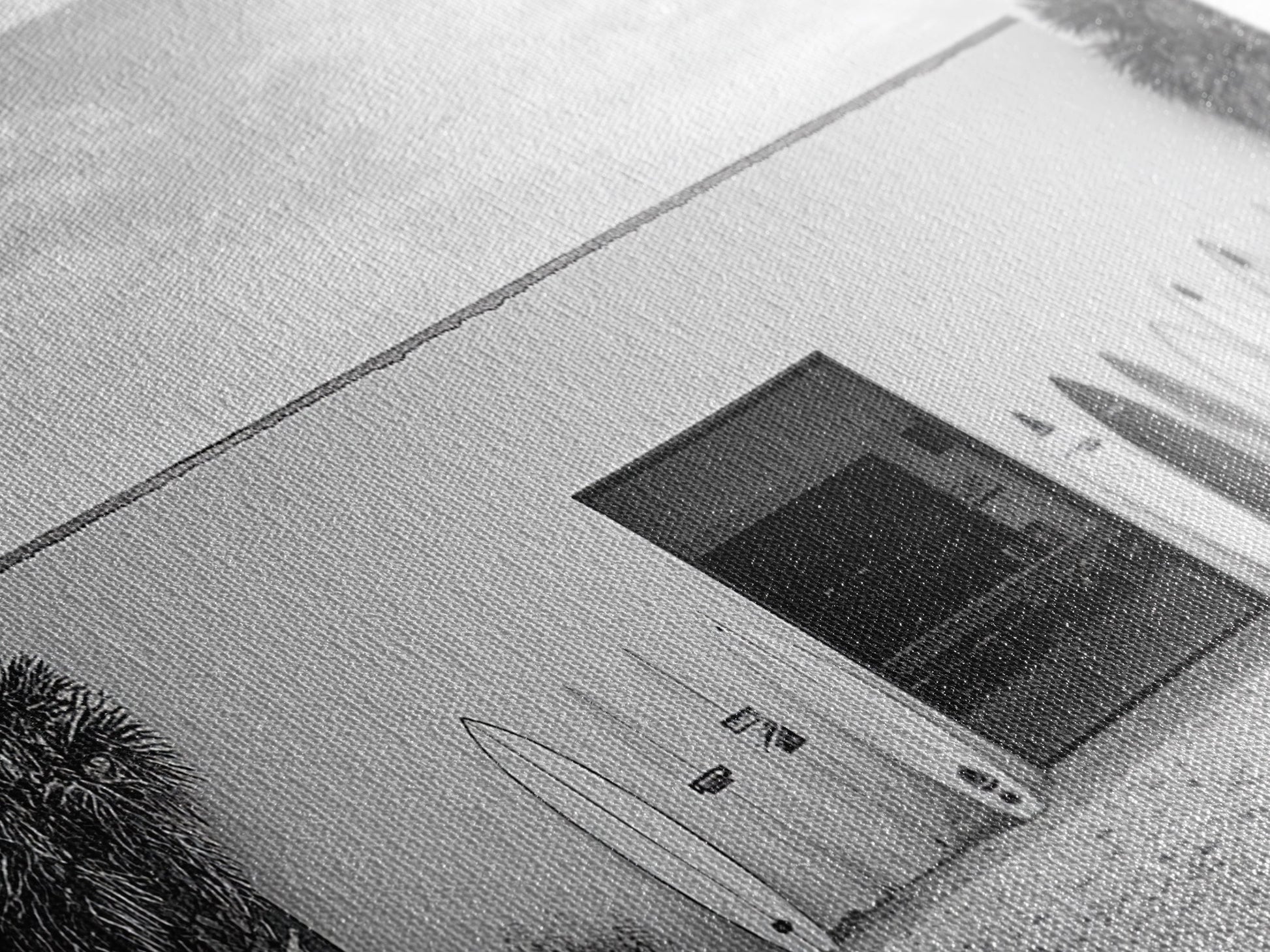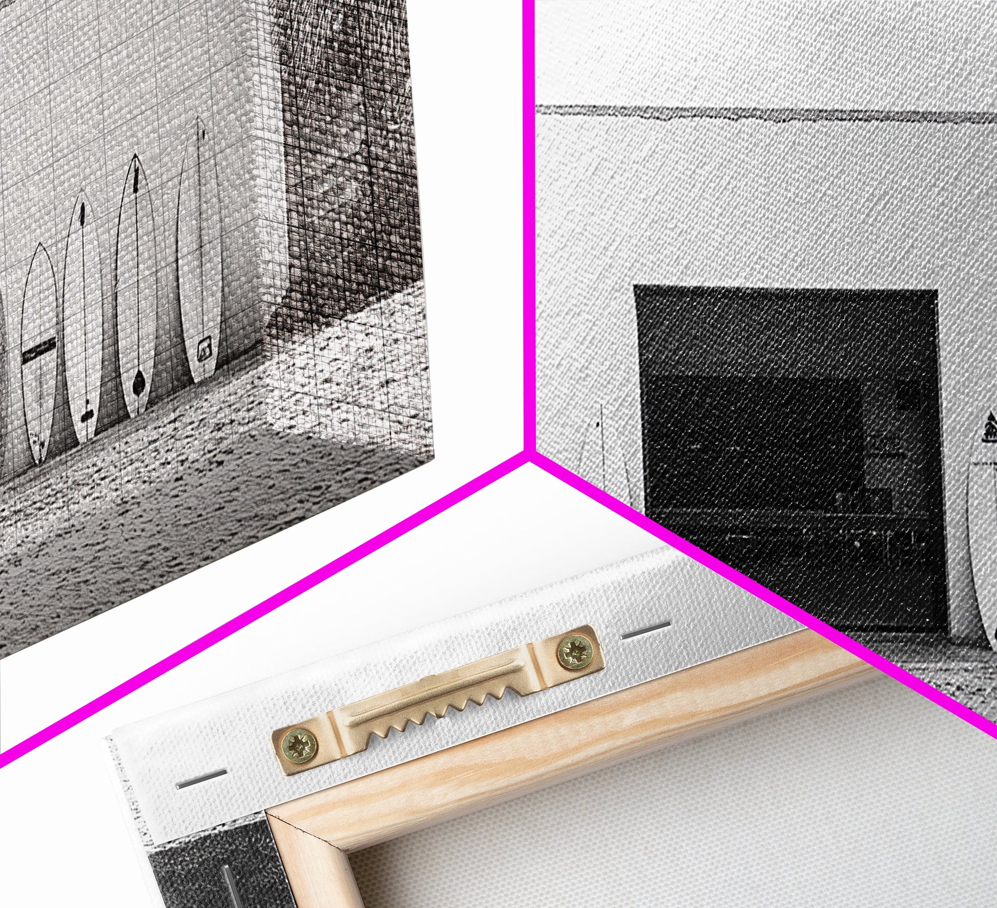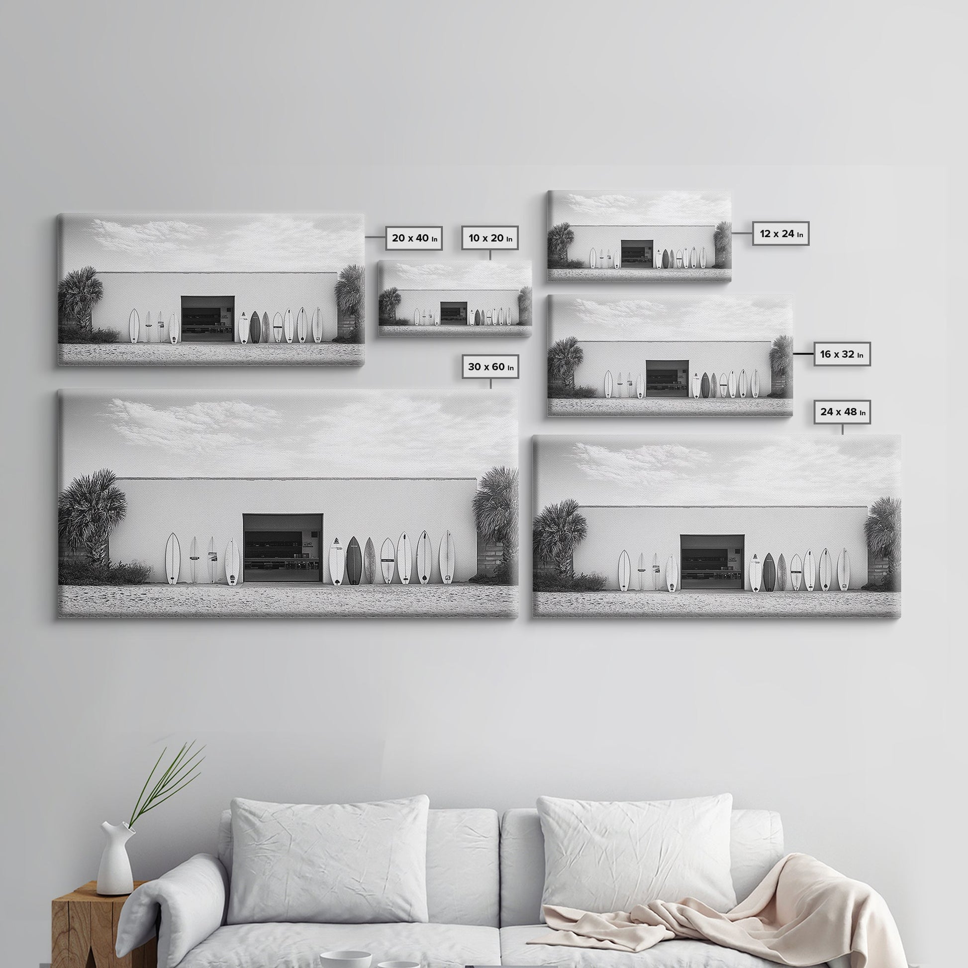 Surfboards, Beach Garage, Modern Coastal, Ocean Style, Framed Canvas Print, surf shack decor, teen room wall art, minimalist beach art
