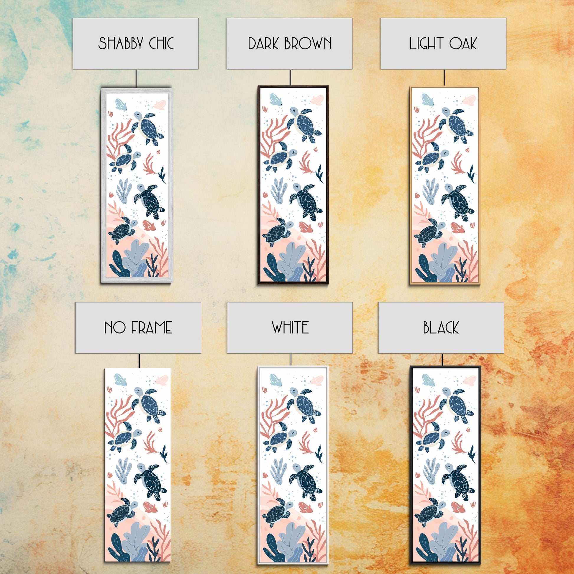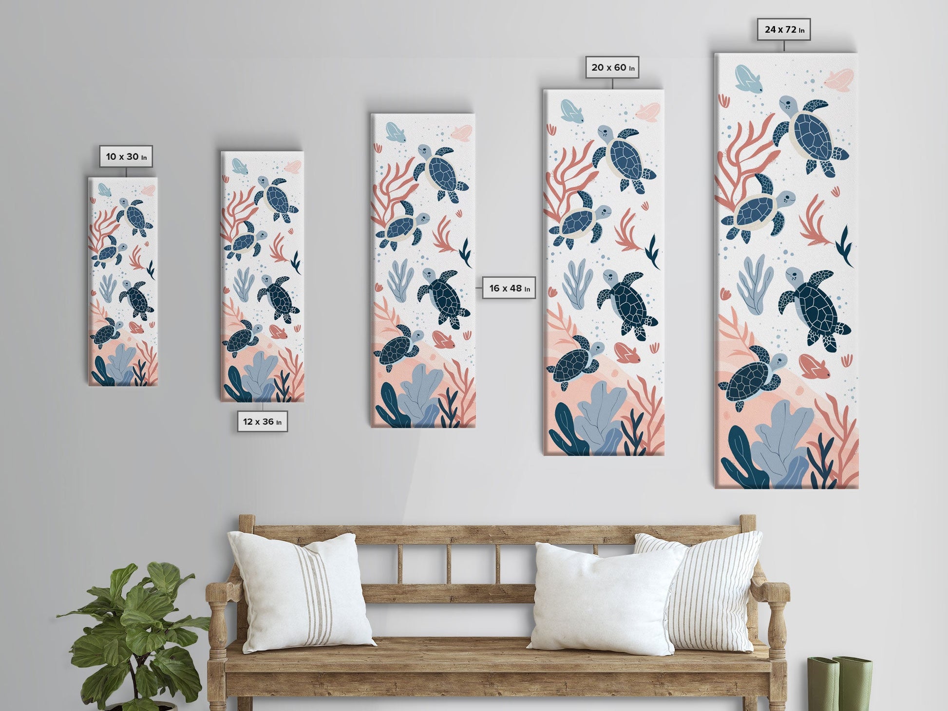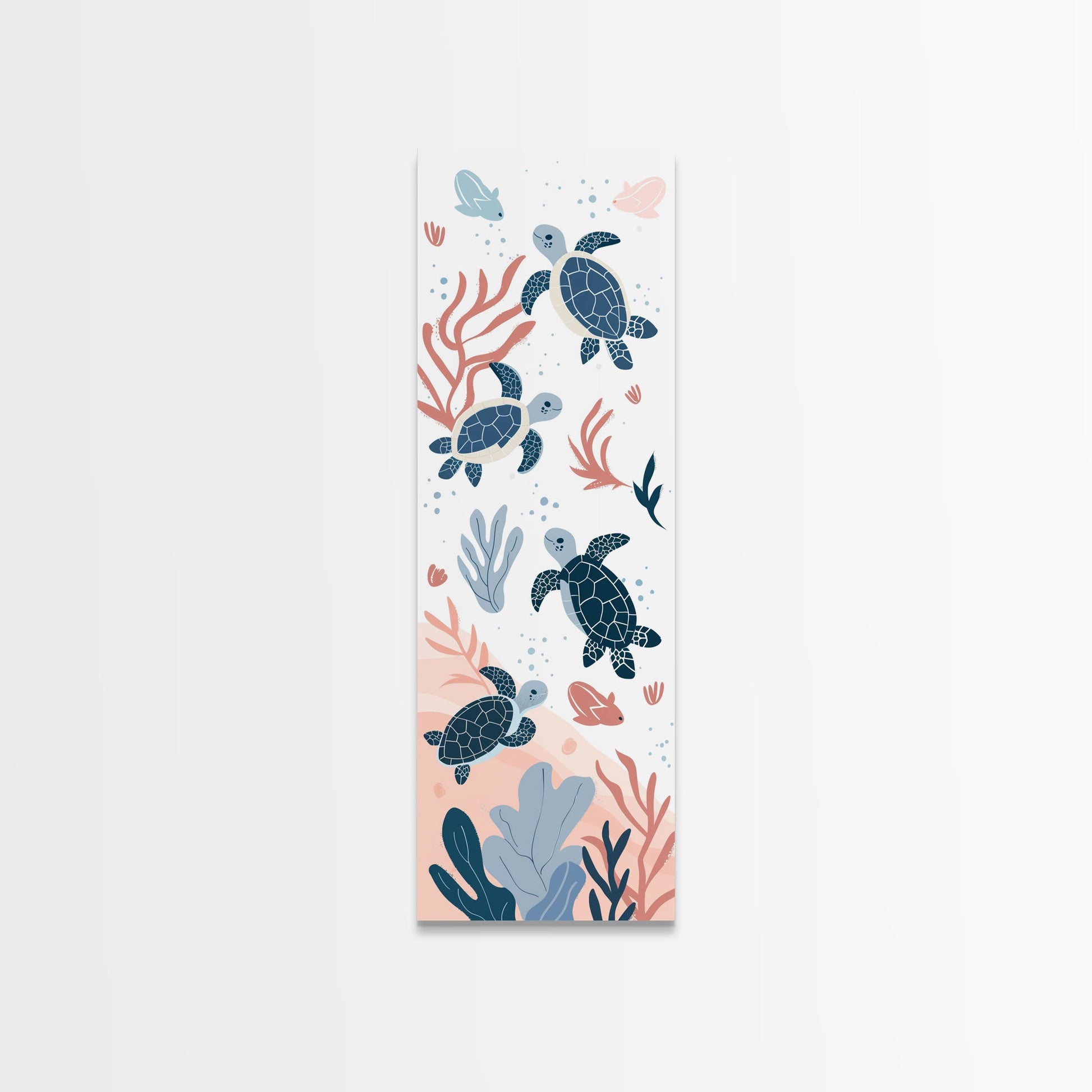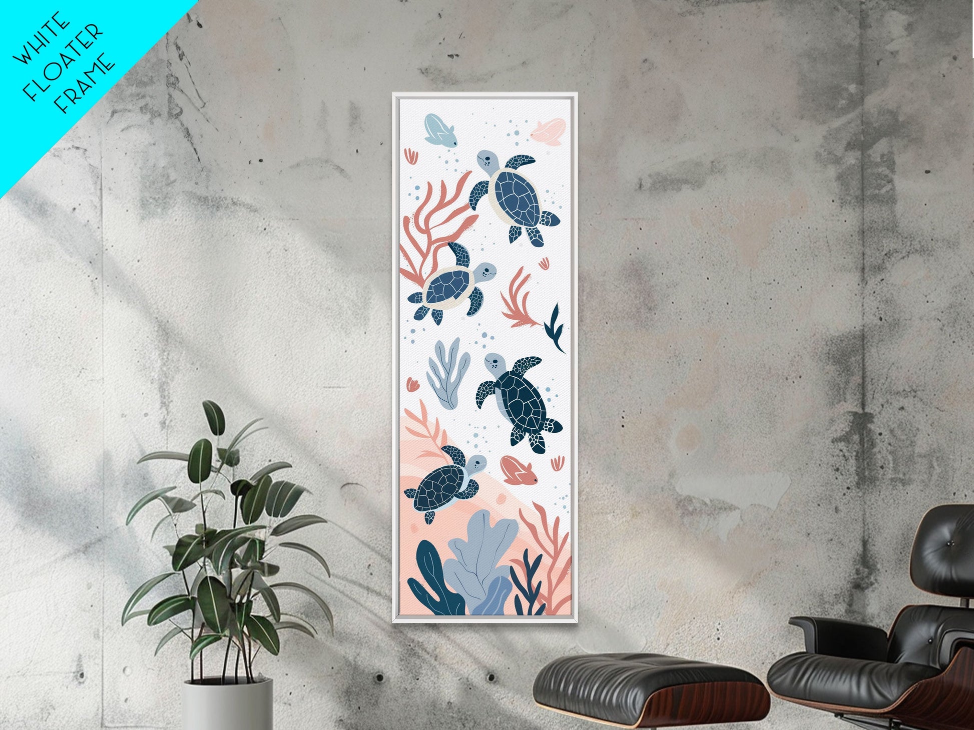 Swimming Sea Turtles with Coral, Tall Framed Canvas Print in Japanese Ukiyo-e Style Wall Art