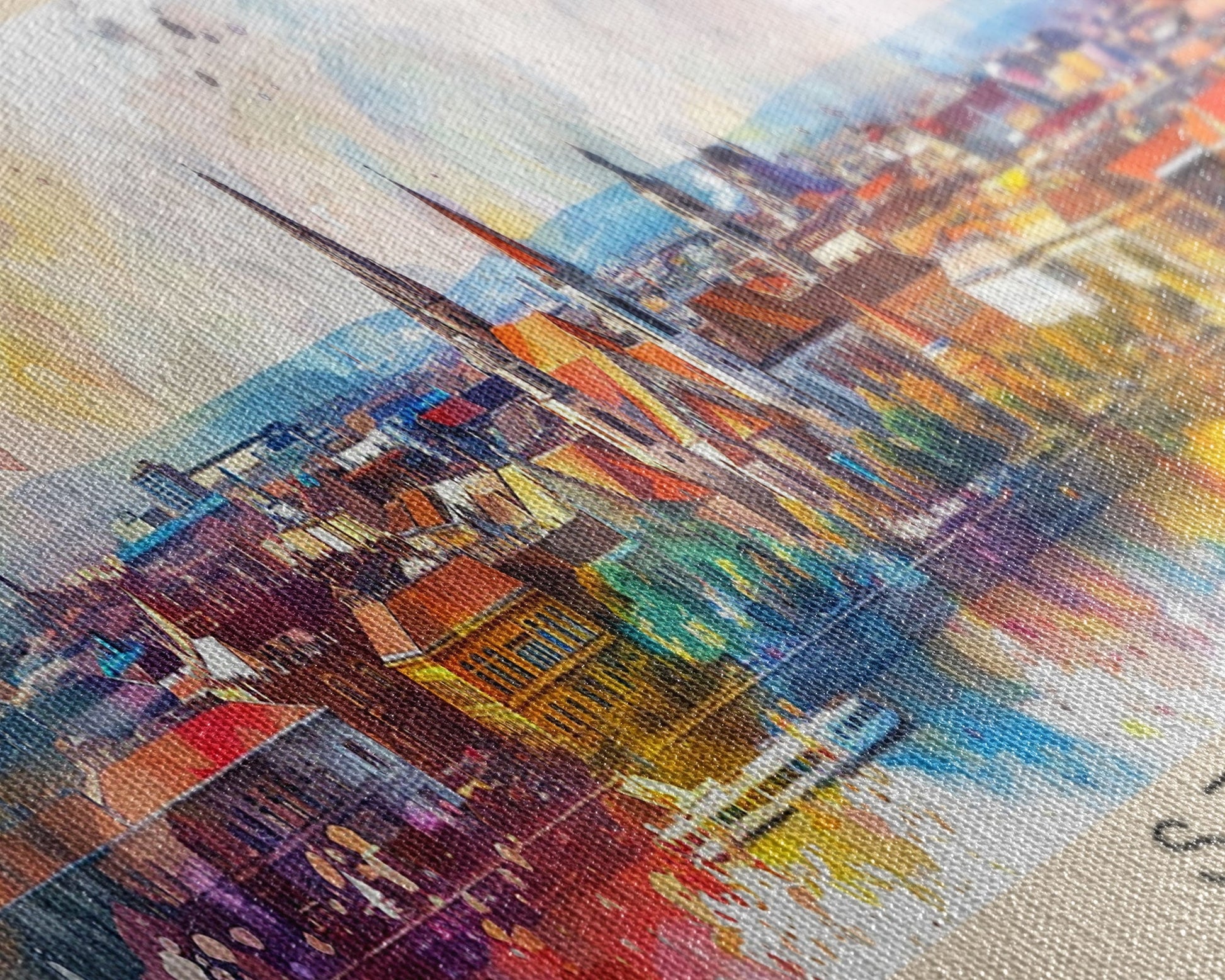 Most of our canvases are made in the USA, with the exception of canvases ordered with the light oak unstained frames, and any large canvases (24x48, 30x60, 16x48 and 20x60) ordered WITH a frame. These are temporarily made in and shipped from Europe, while we try to find a more consistent supplier in the USA.
