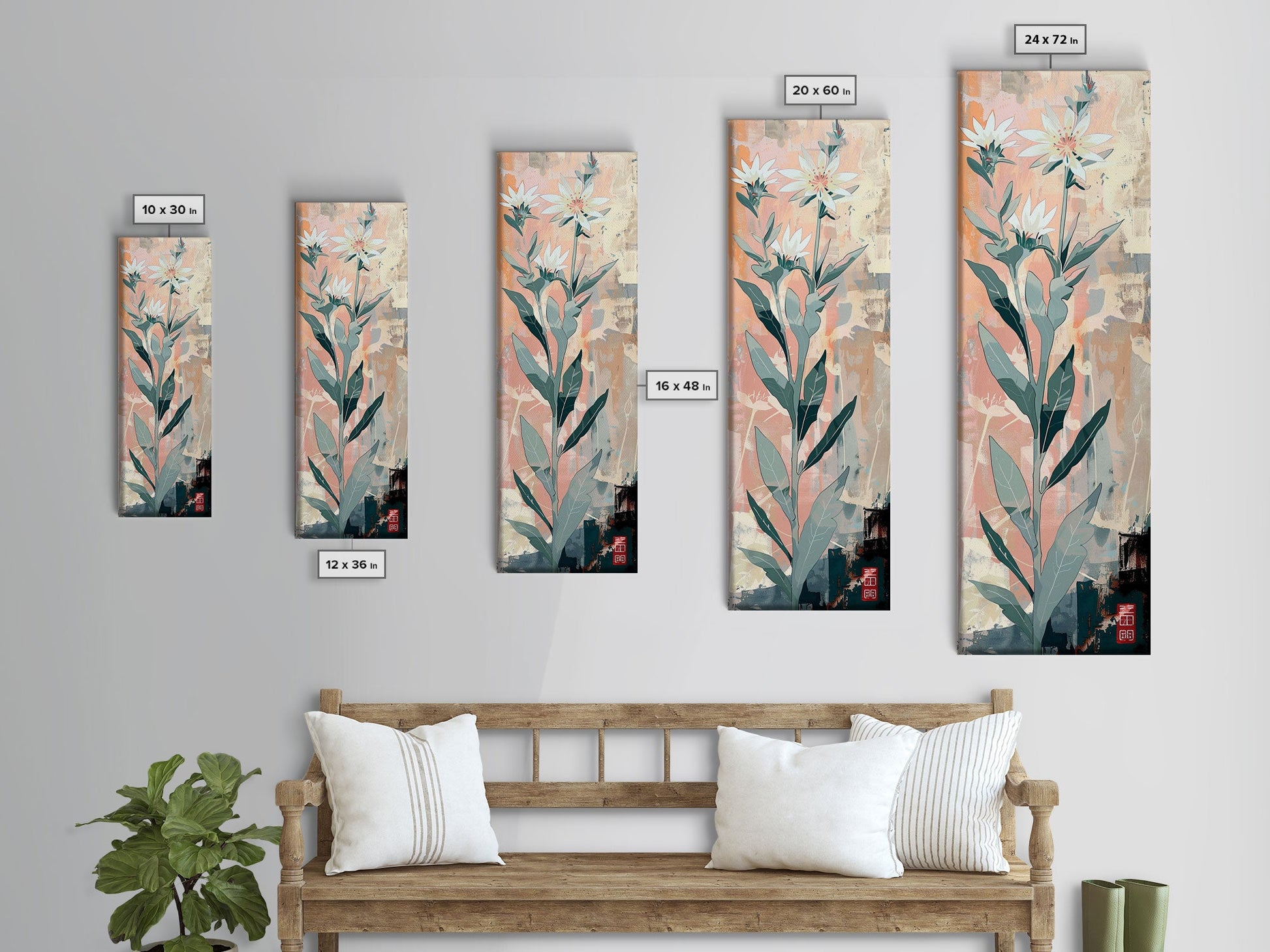 Tall Stemmed Wildflowers Abstract Background Japanese Style Tall Skinny Framed Canvas Print Wall Art