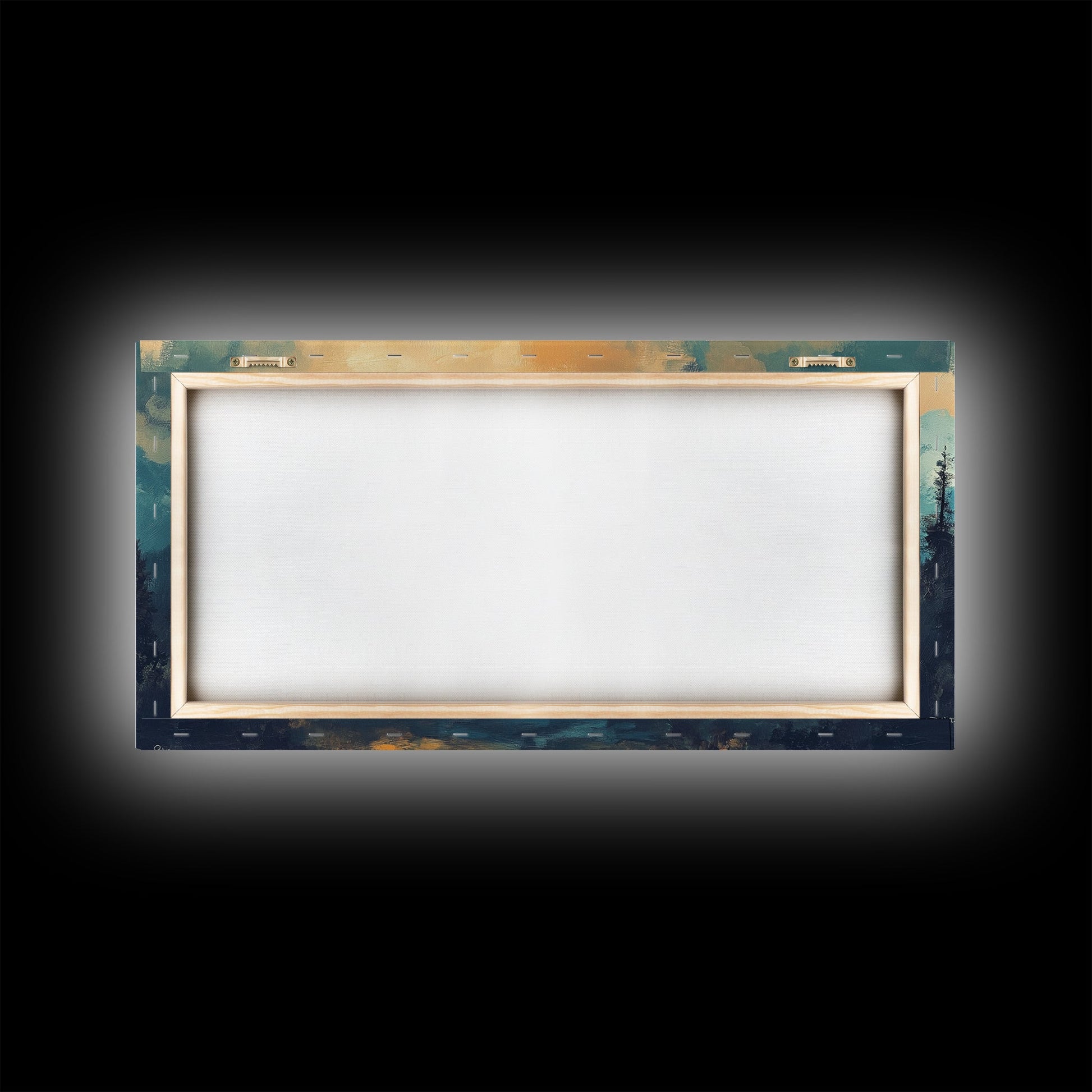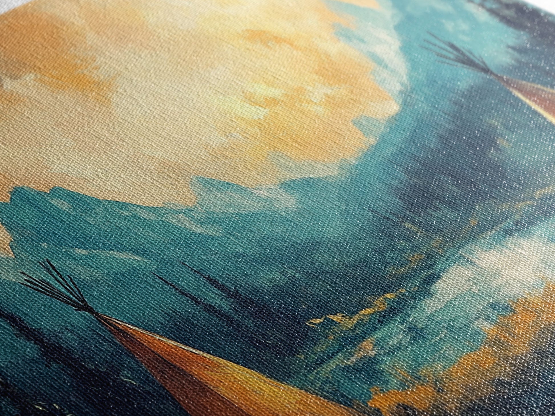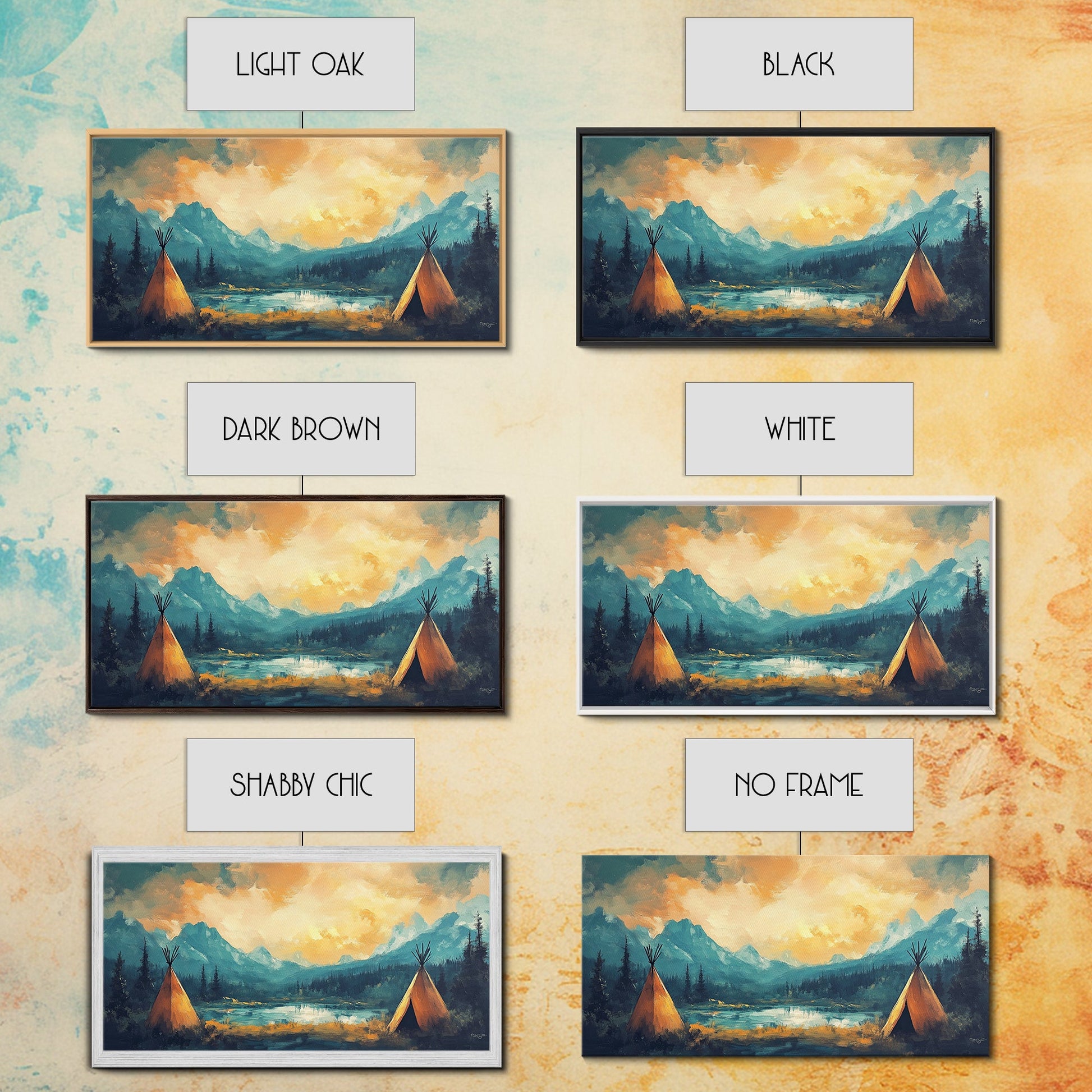 Teepee Camp, southwest wall art, landscape painting, mountain painting, rustic decor, moody art, Framed Canvas Print, panoramic painting