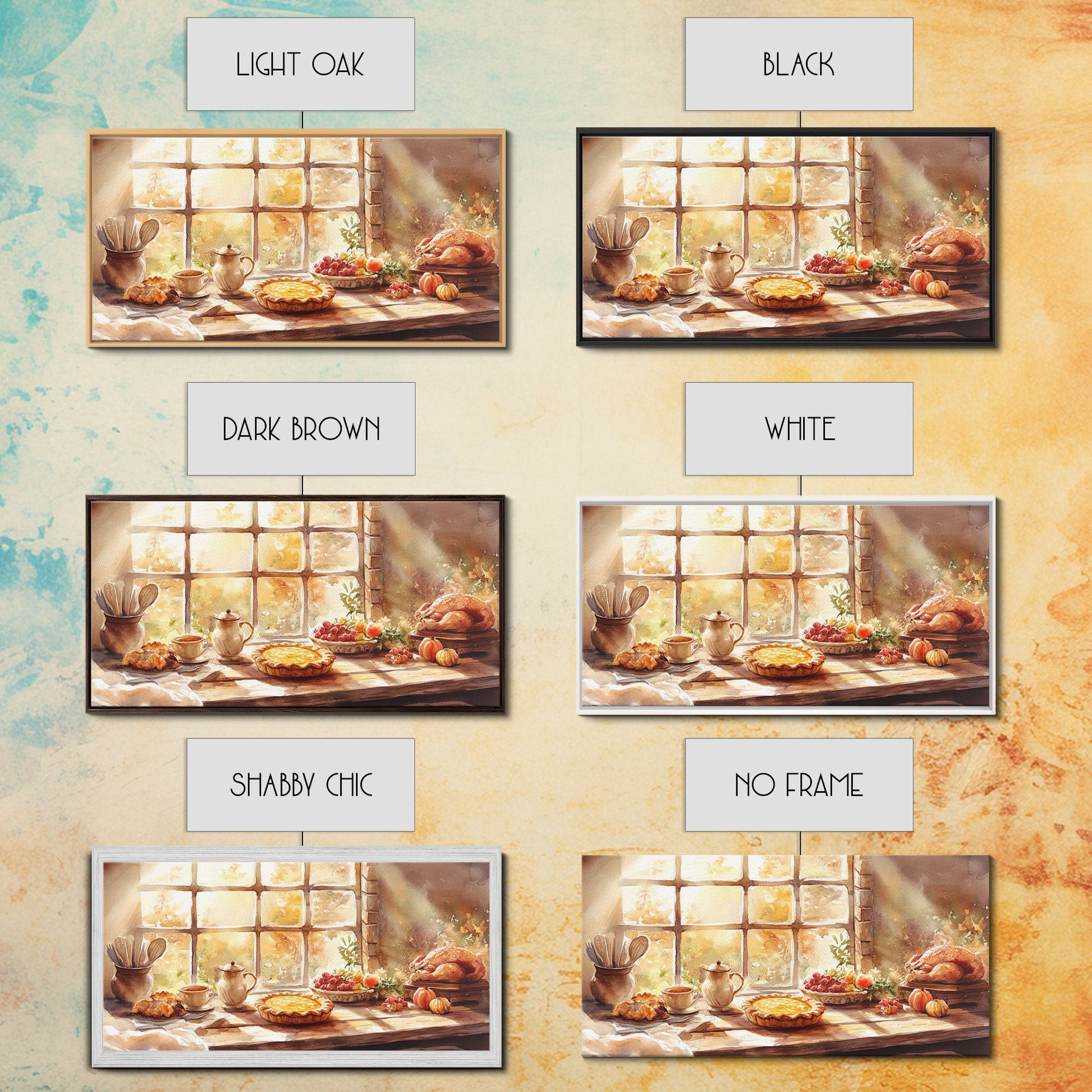 Thanksgiving table scene with food, pies and fall decor, Framed Canvas Print with pumpkins sunlight, autumn harvest home wall art and decor