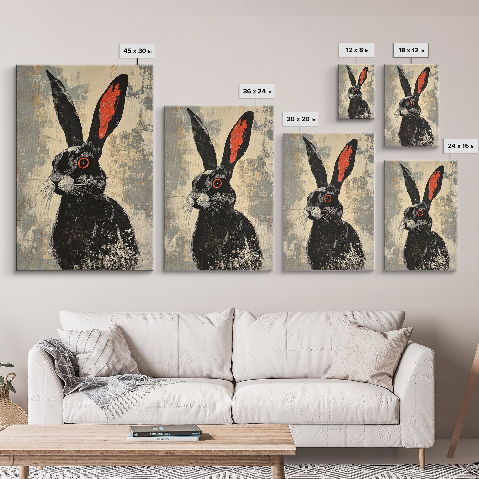 The Black Bunny, Framed Canvas Print Ready To Hang, Bunny Rabbit Art, Rabbit Painting, Minimalist Japanese Style Art