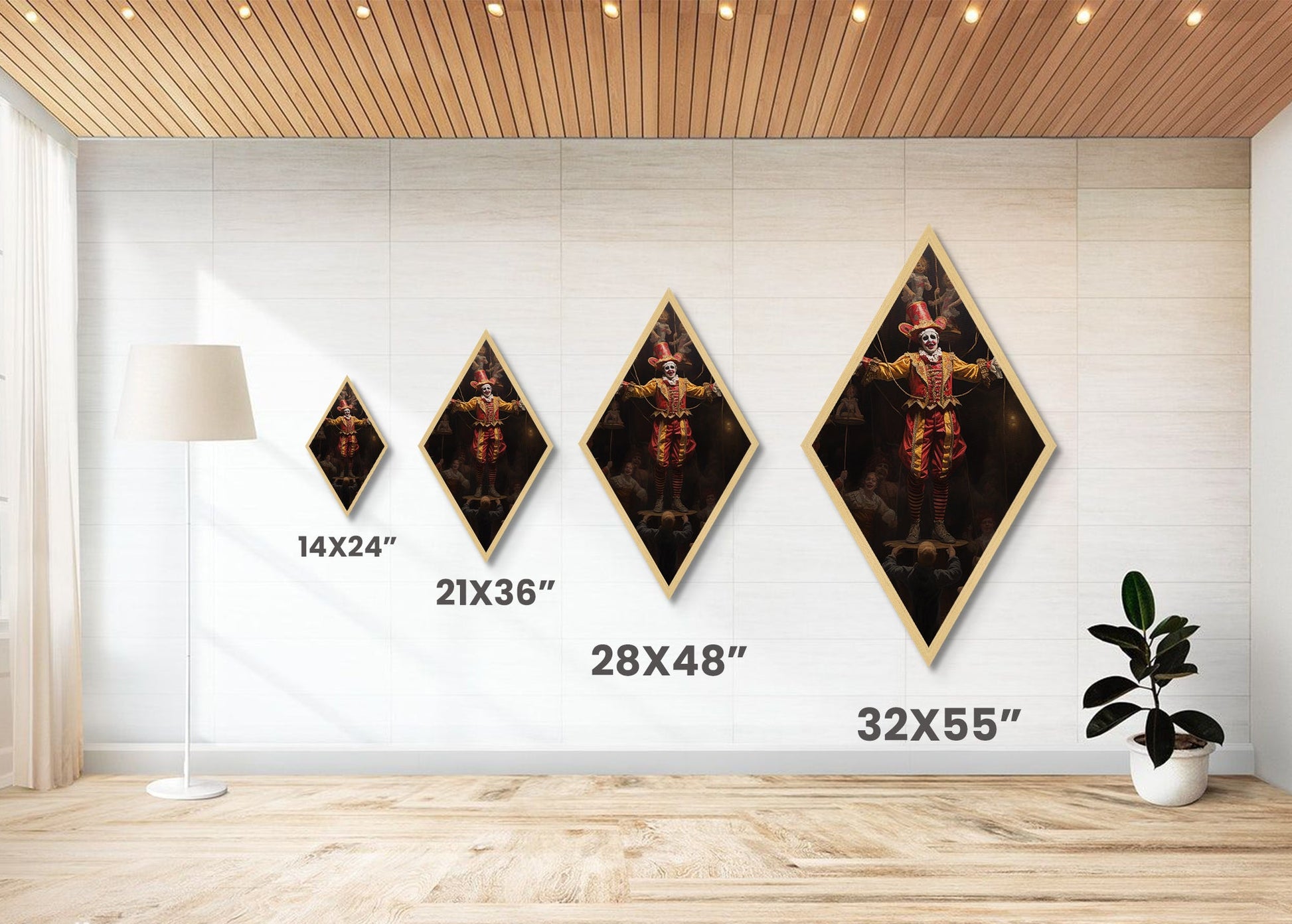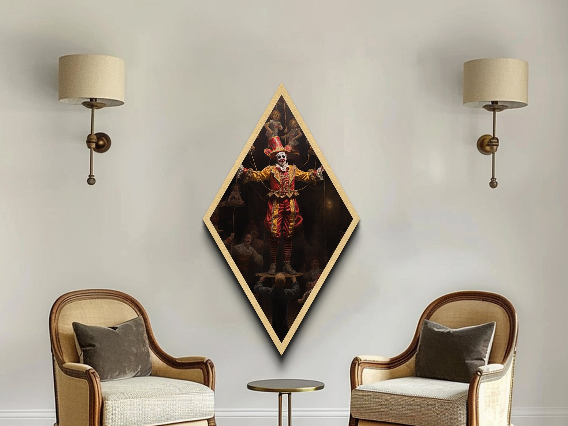 "The Hollow Ringleader" Diamond Shaped Art of Marionette Clown Canvas Embossed Print, Gothic Halloween Carnival Decor in Dark Circus Style