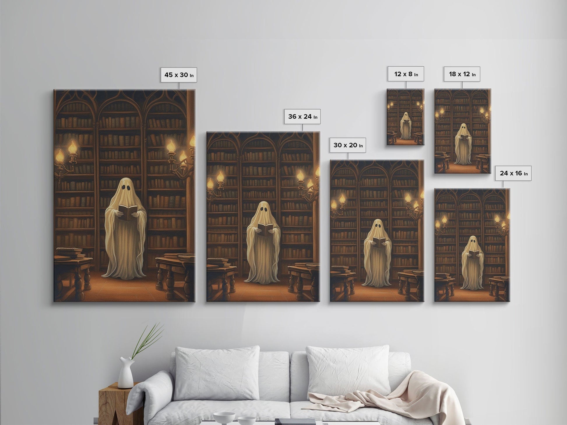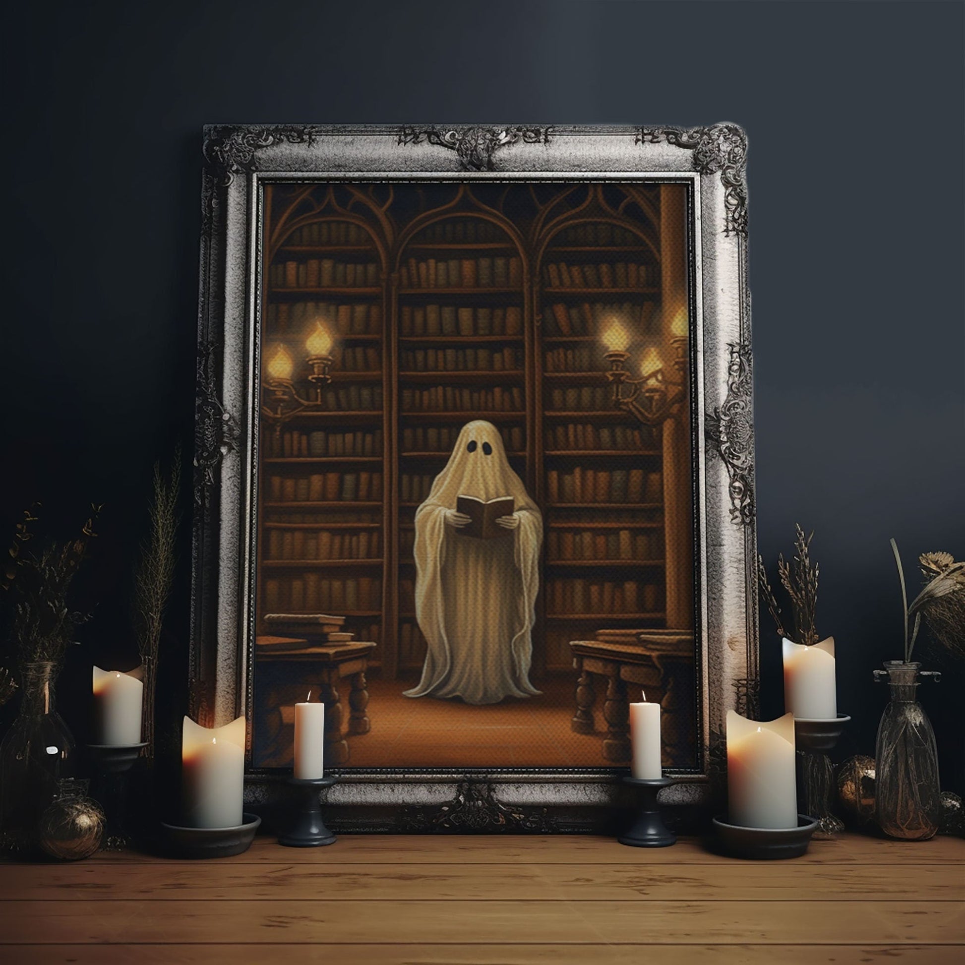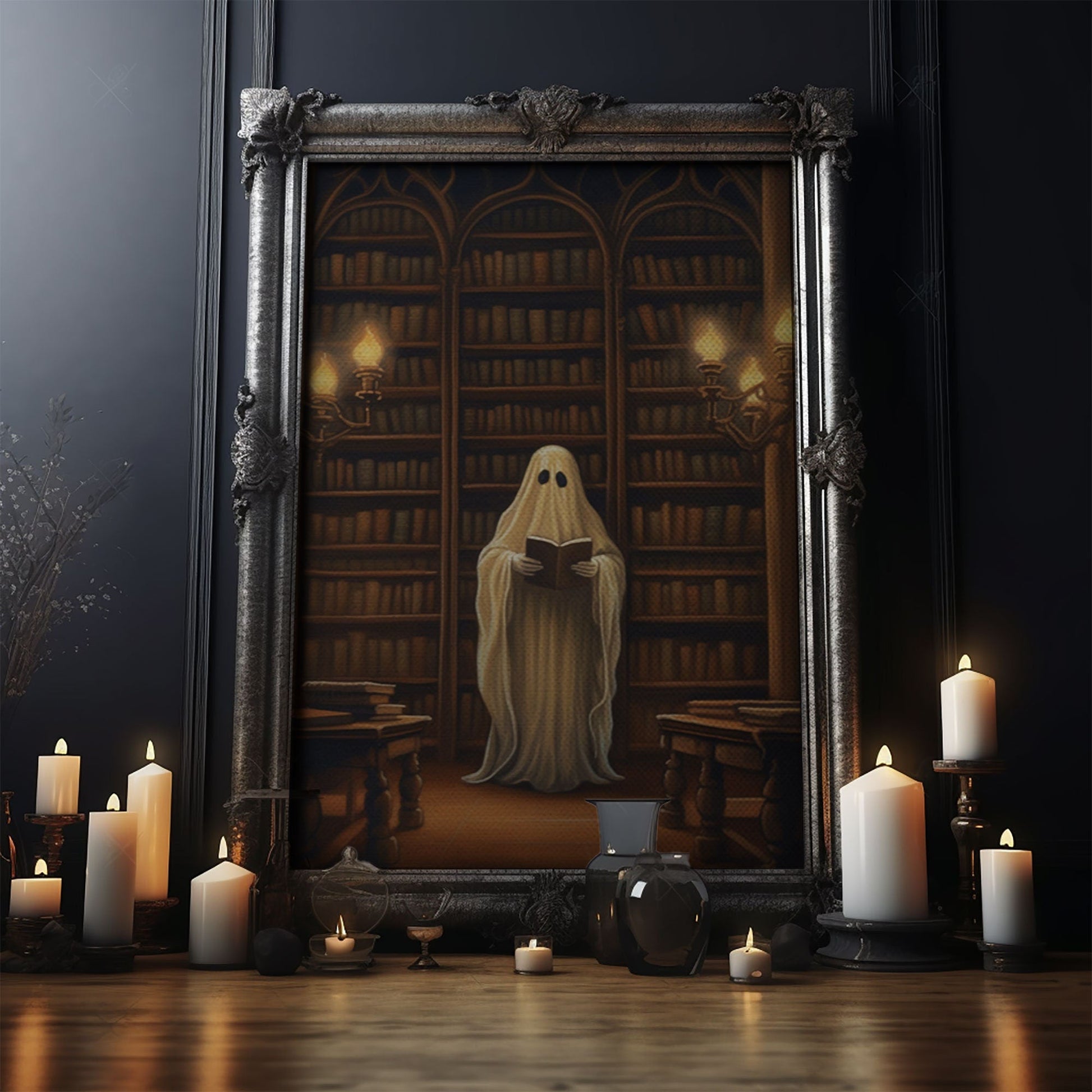 The Spooky Bookshop, Spooky Ghost, Fine Art Print, Halloween Wall Art, Fall Artwork, Halloween, Spooky Haunted Library, White Sheet Ghost