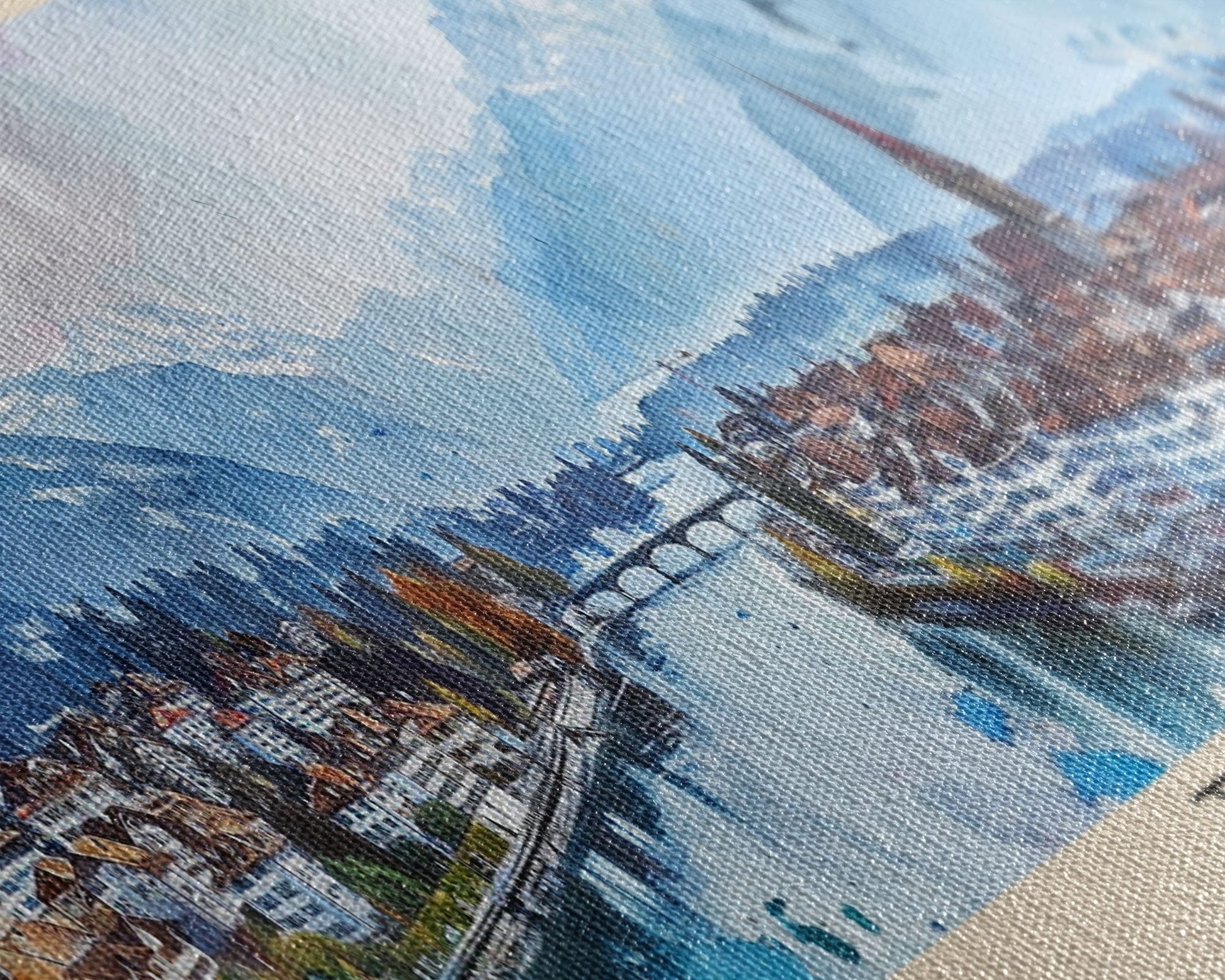 Most of our canvases are made in the USA, with the exception of canvases ordered with the light oak unstained frames, and any large canvases (24x48, 30x60, 16x48 and 20x60) ordered WITH a frame. These are temporarily made in and shipped from Europe, while we try to find a more consistent supplier in the USA.