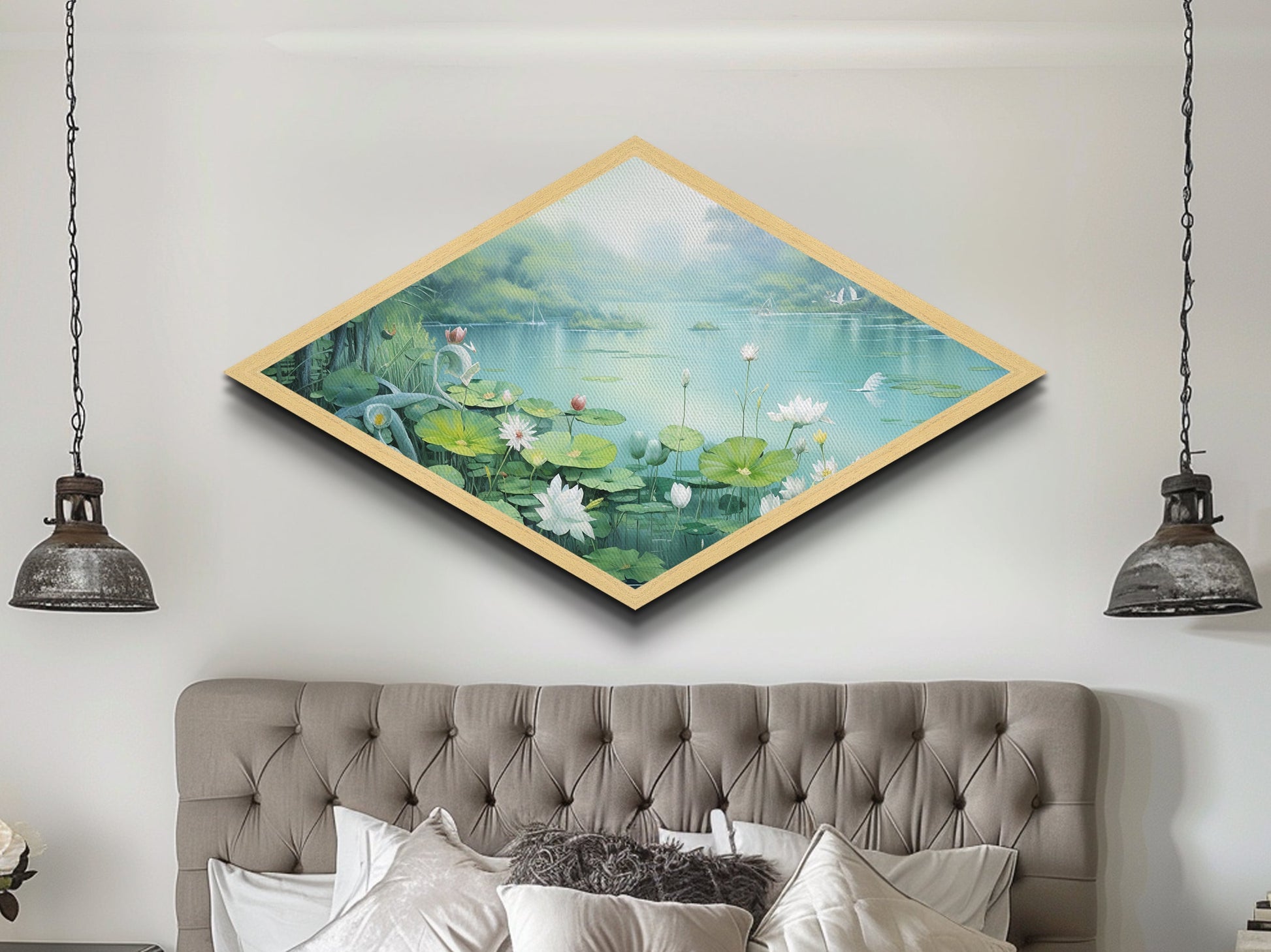 Tranquil Lily Pond Diamond Shaped Canvas Textured Print with peaceful lotus flowers, lake landscape art, spa room wall decoration