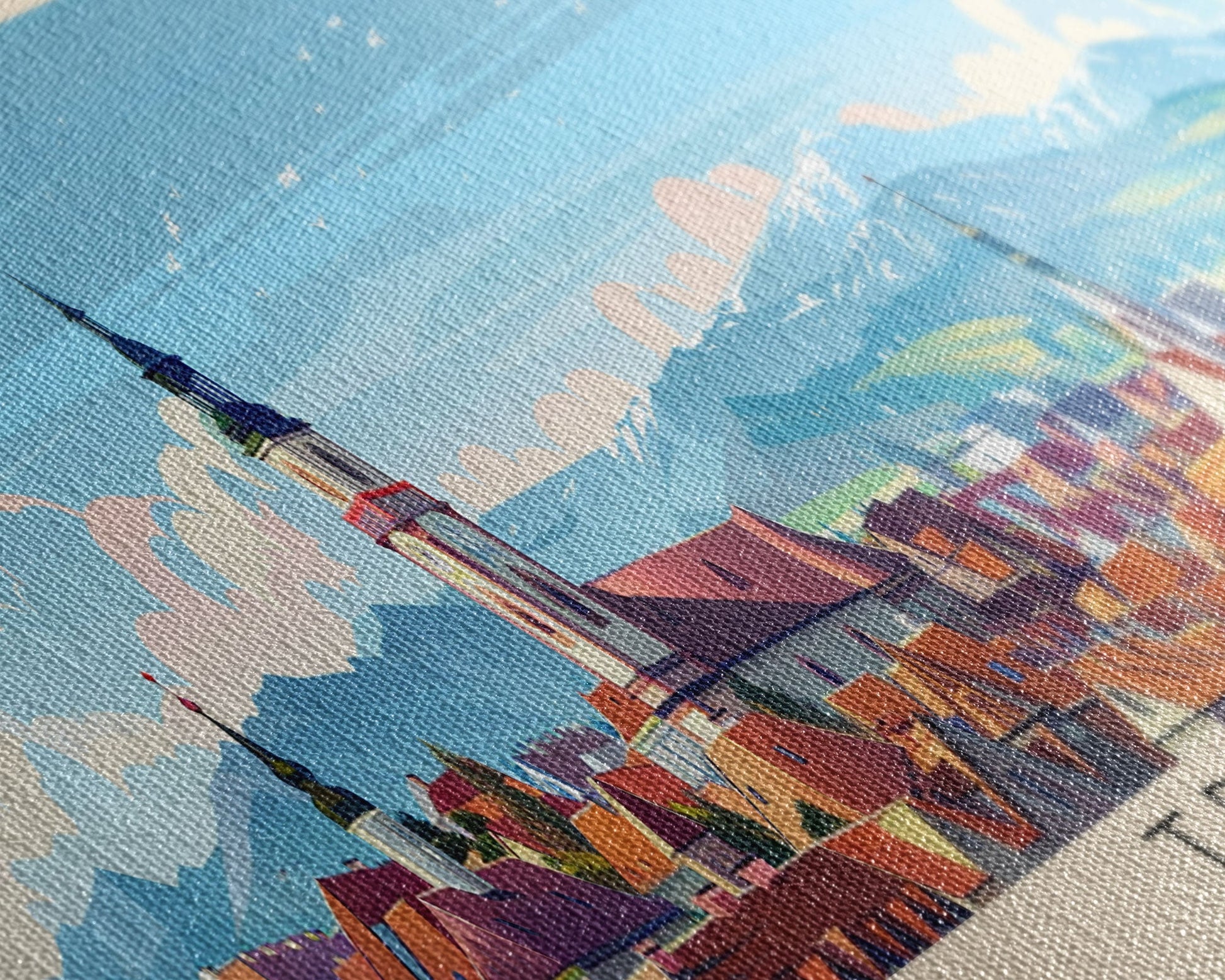 Most of our canvases are made in the USA, with the exception of canvases ordered with the light oak unstained frames, and any large canvases (24x48, 30x60, 16x48 and 20x60) ordered WITH a frame. These are temporarily made in and shipped from Europe, while we try to find a more consistent supplier in the USA.