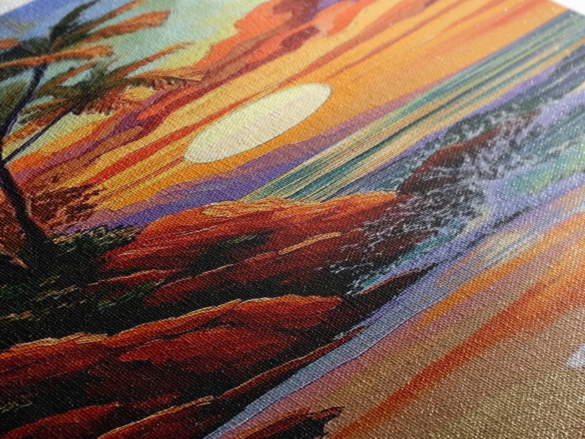 Tropical Sunset, Palms, Beach Framed Canvas Print vibrant tropical sunset scene, palm tree ocean art, vacation vibes, hallway wall print