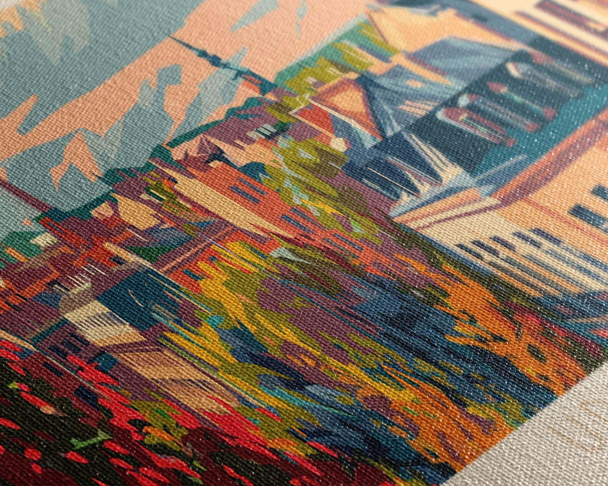 Most of our canvases are made in the USA, with the exception of canvases ordered with the light oak unstained frames, and any large canvases (24x48, 30x60, 16x48 and 20x60) ordered WITH a frame. These are temporarily made in and shipped from Europe, while we try to find a more consistent supplier in the USA.