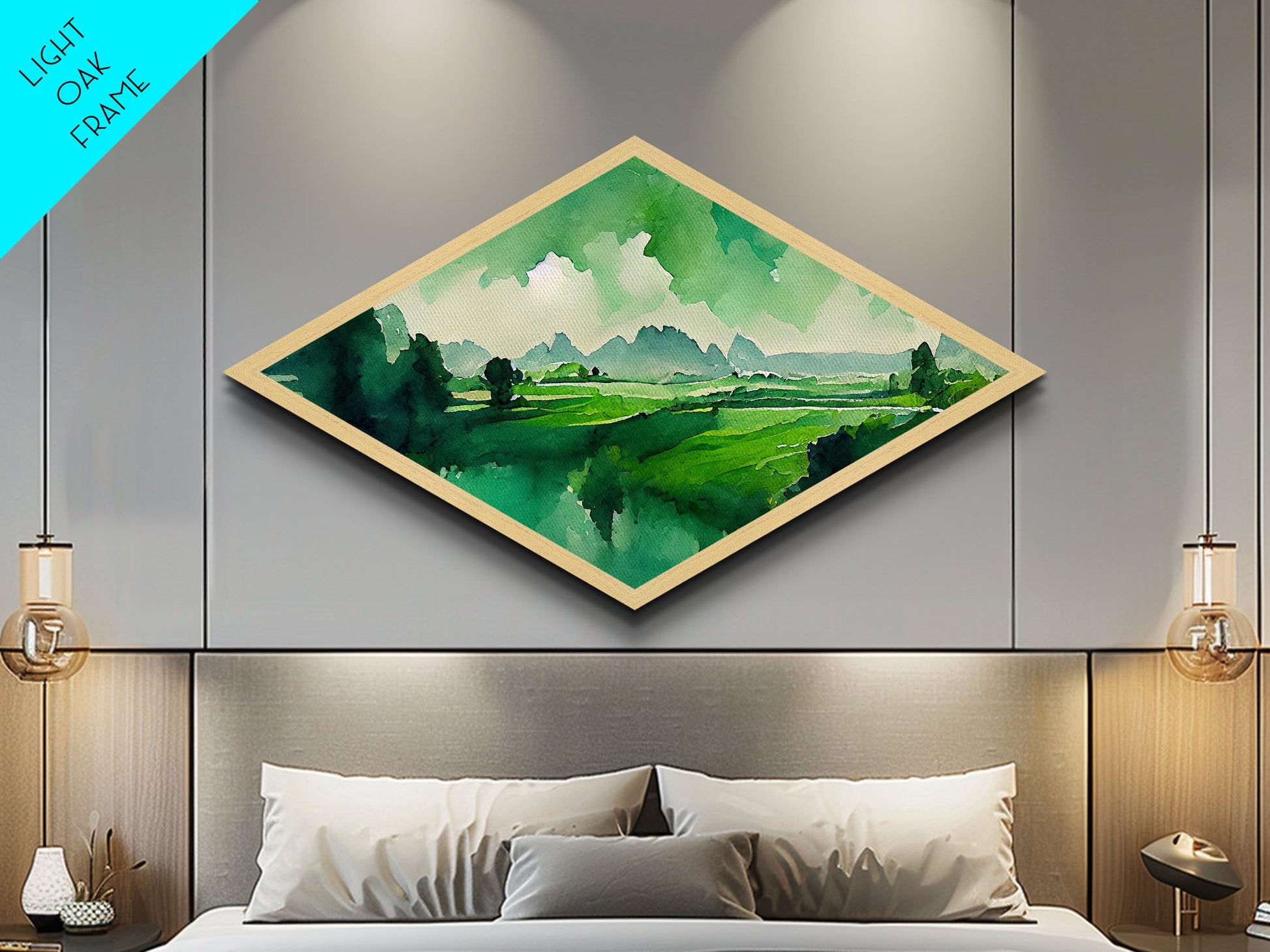 Verdant Horizon Diamond Shaped Landscape Wall Art Canvas Embossed Print Green Mountain Nature Illustration Pastoral Home Decor Accent