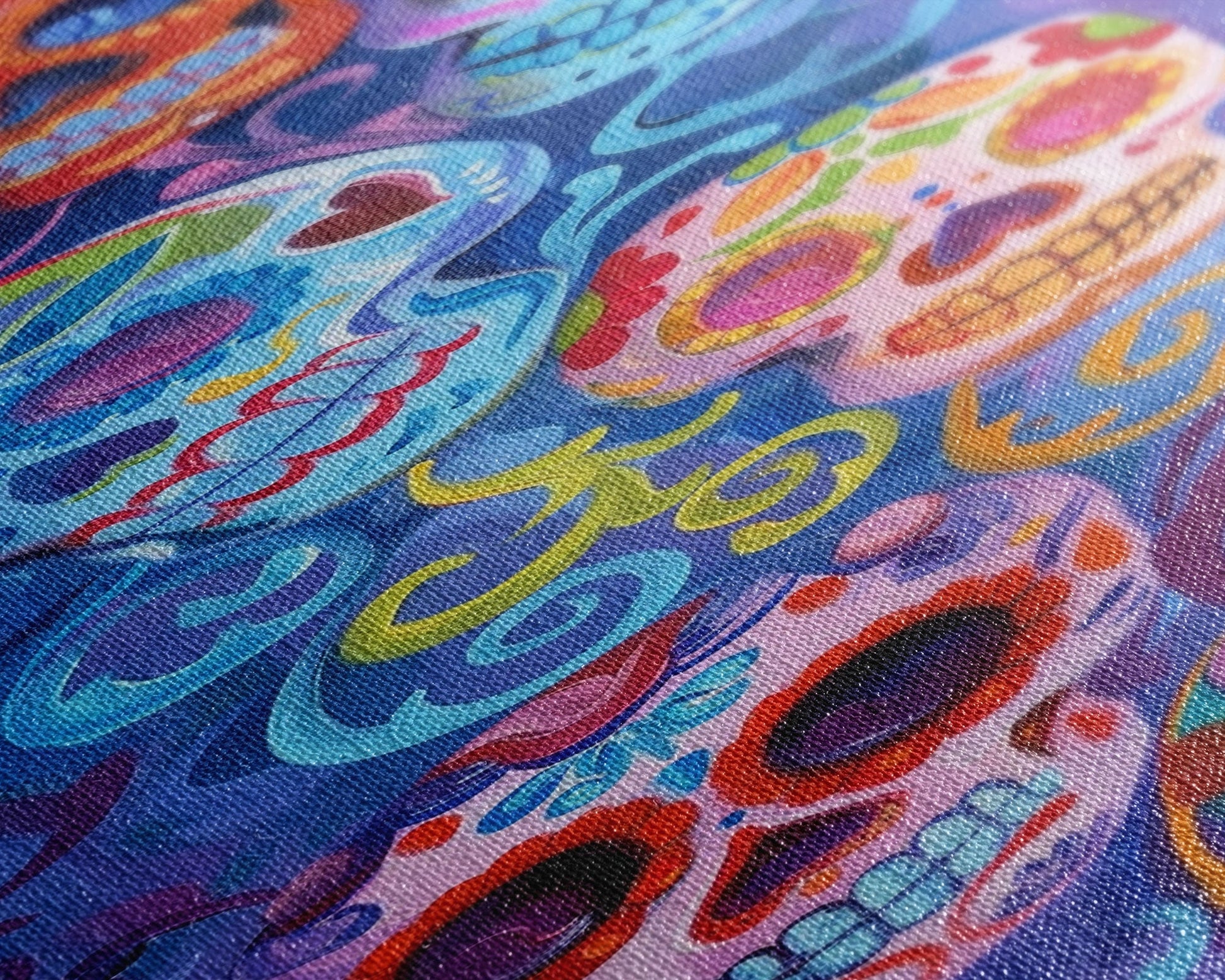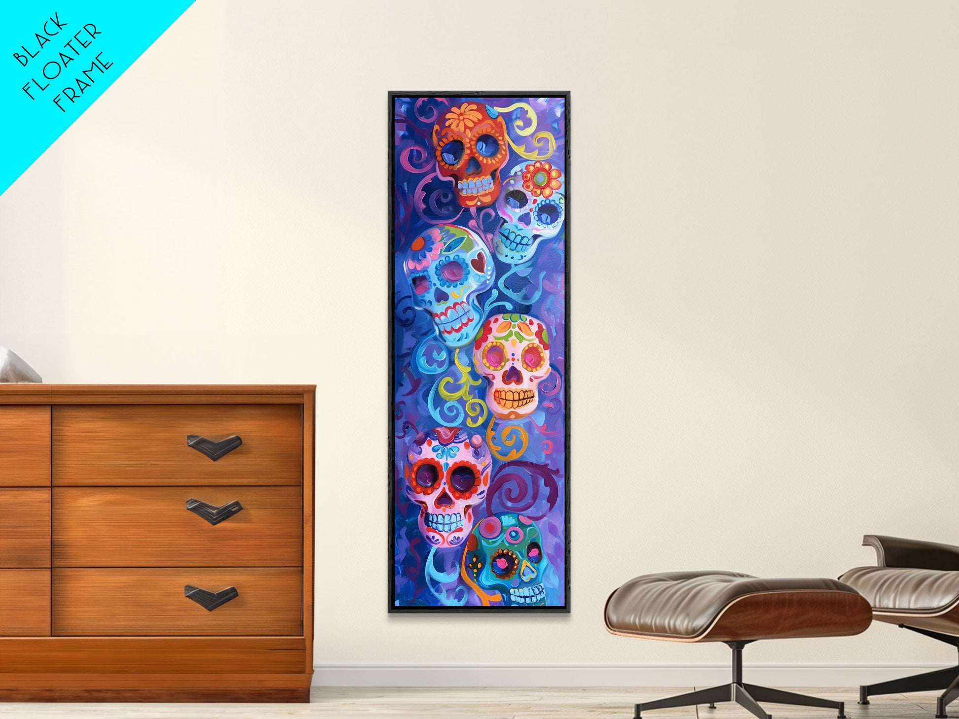 Vertical Calavera Sugar Skull Day of The Dead Canvas Painting Framed, Mexican Framed Art, Colorful Living Room Wall Art, Modern Abstract Art