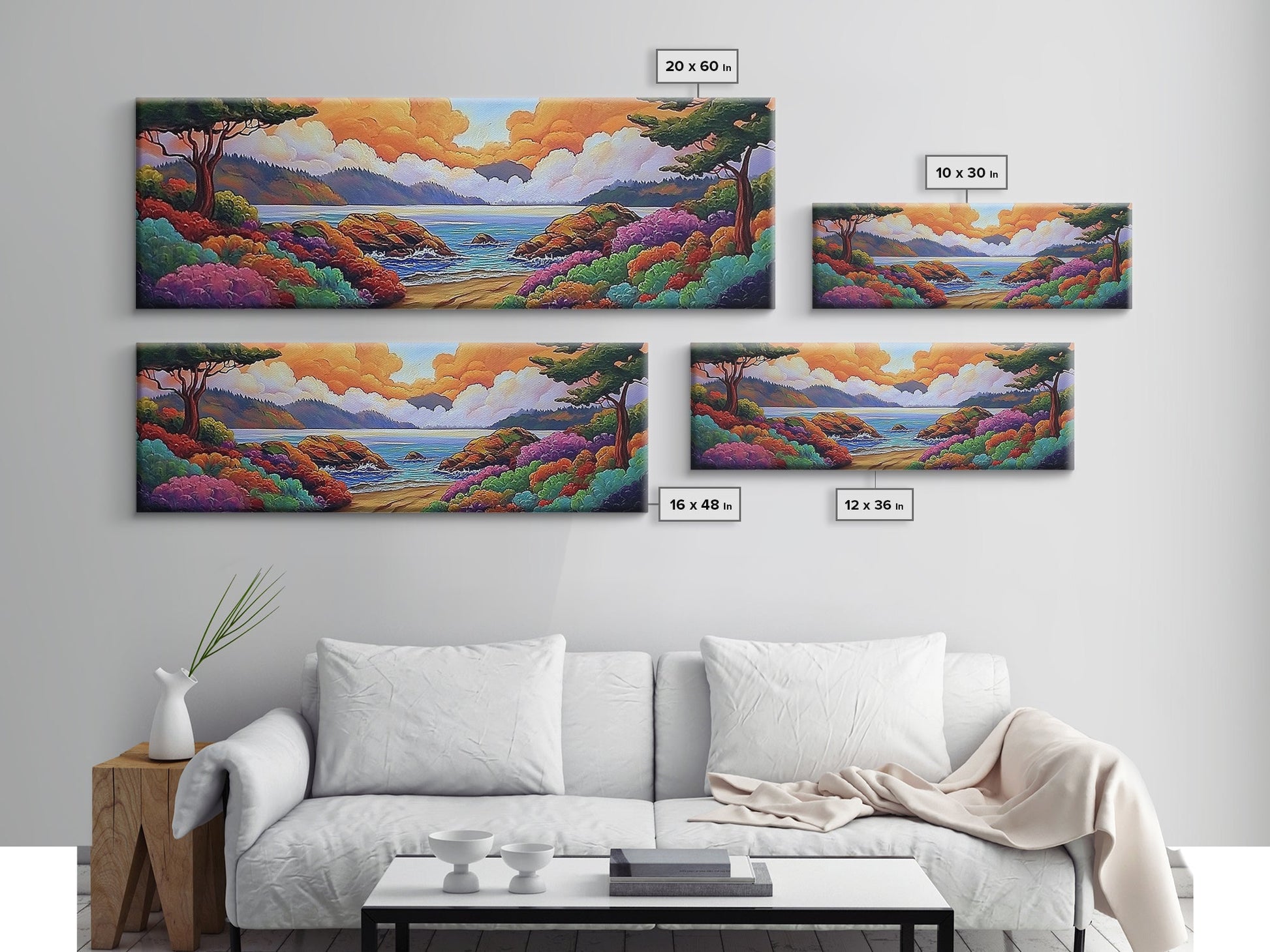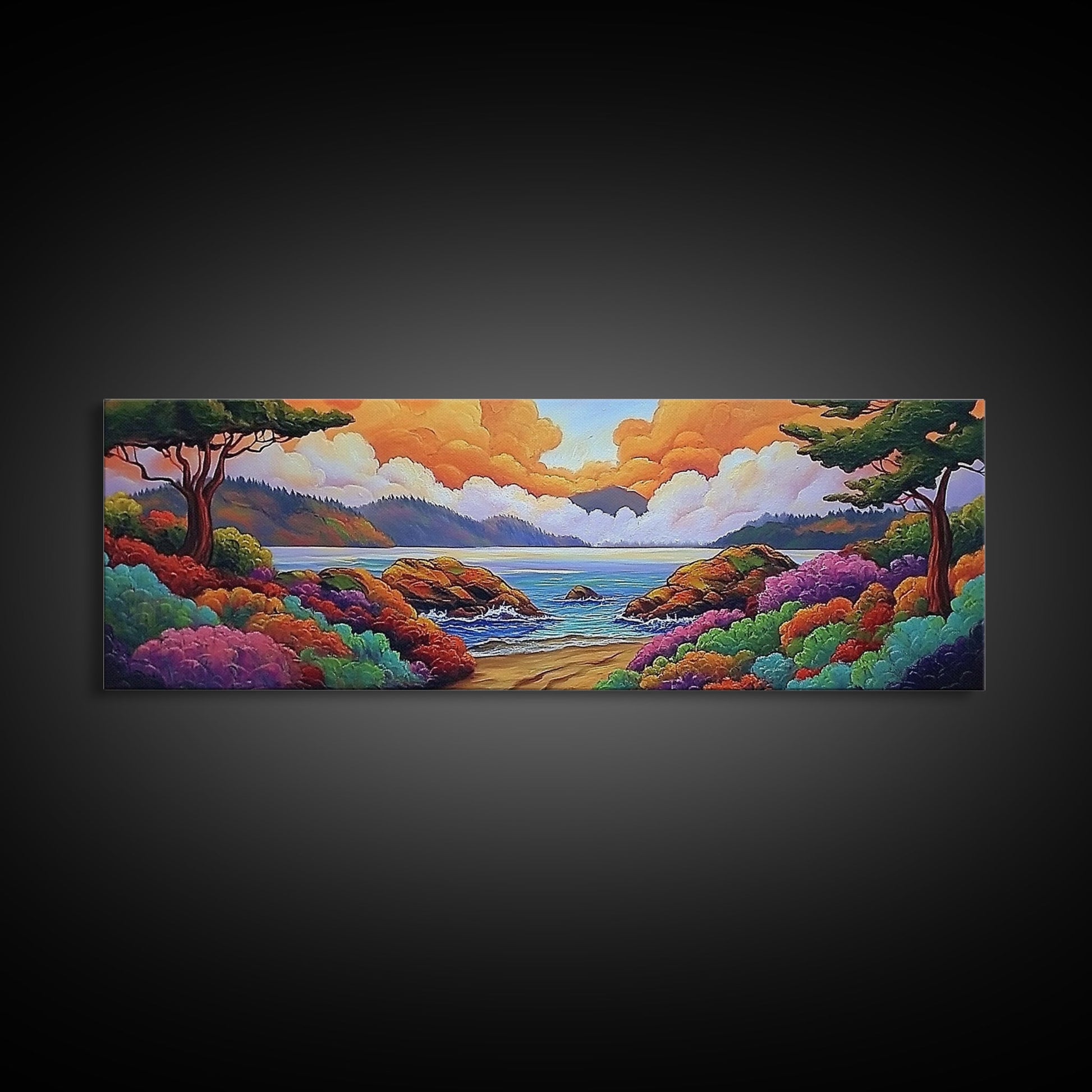 Vibrant Coastal View, Ocean Sunset Landscape, Floral Beach Scene, Framed Canvas Print, Colorful Wall Art, Tropical Living Room