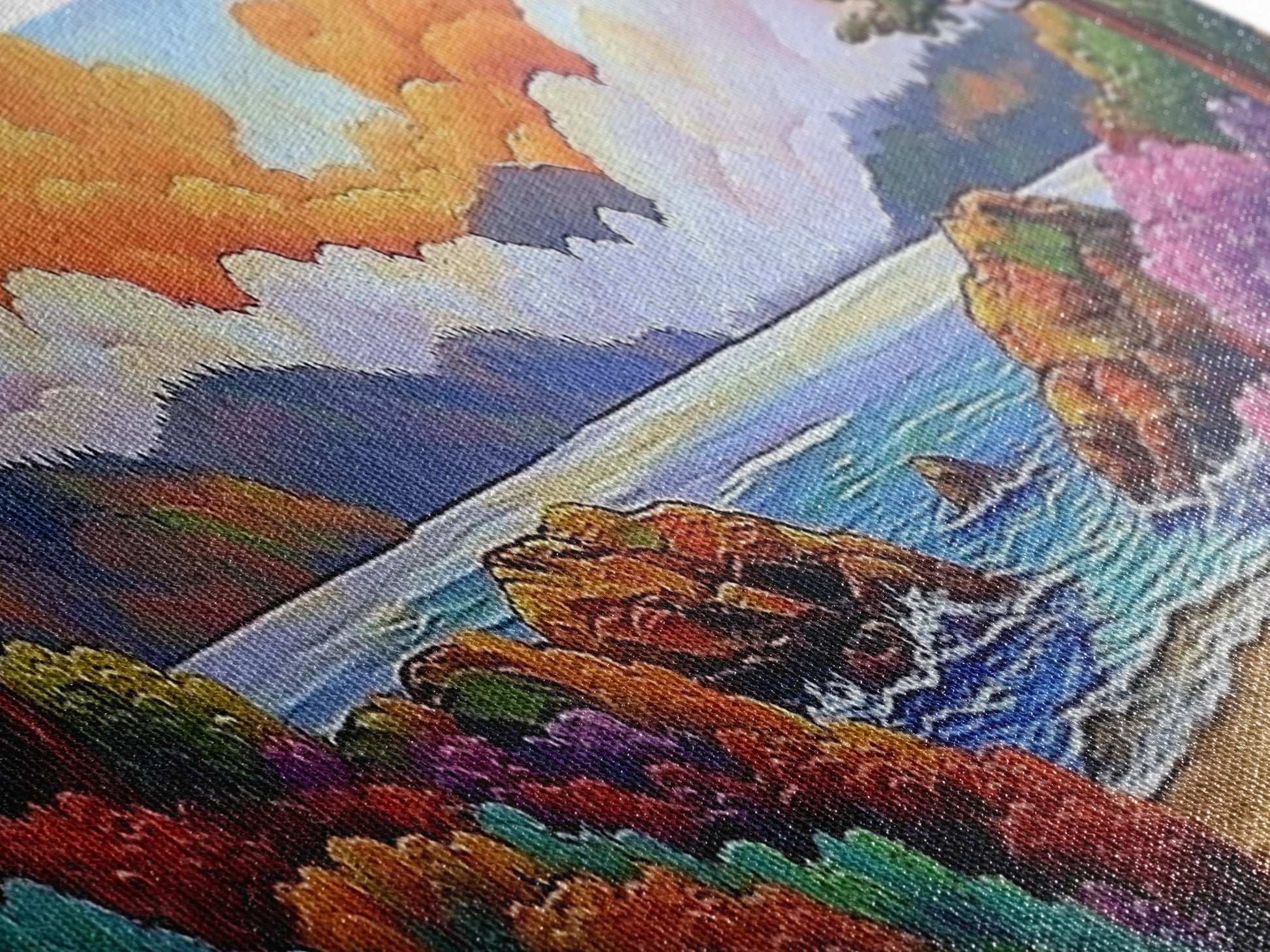 Most of our canvases are made in the USA, with the exception of canvases ordered with the light oak unstained frames, and any large canvases (24x48, 30x60, 16x48 and 20x60) ordered WITH a frame. These are temporarily made in and shipped from Europe, while we try to find a more consistent supplier in the USA.
