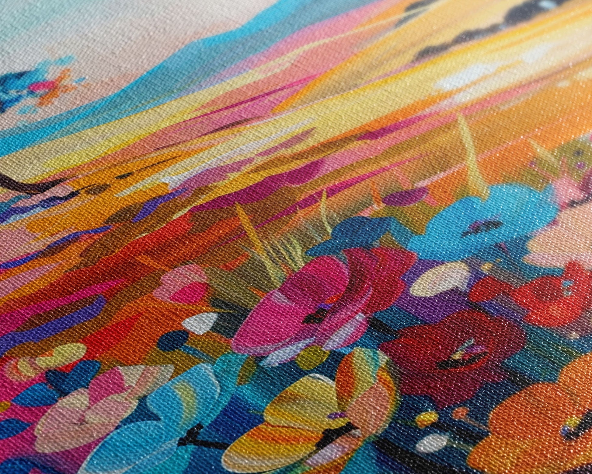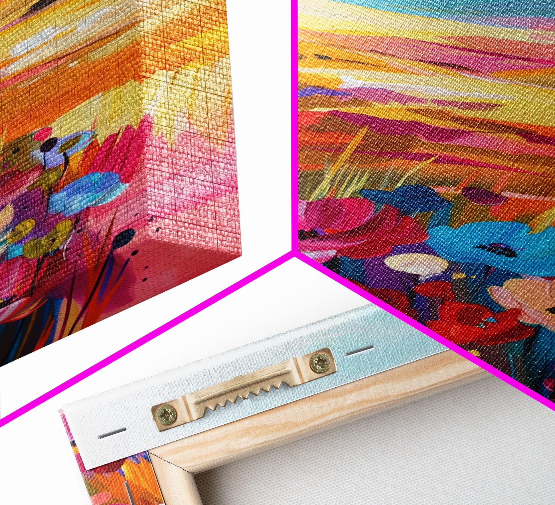 Vibrant Hills and Flowers Framed Canvas Print - Colorful Landscape Wall Art, Bright Living Room Decor, Whimsical Bedroom Art