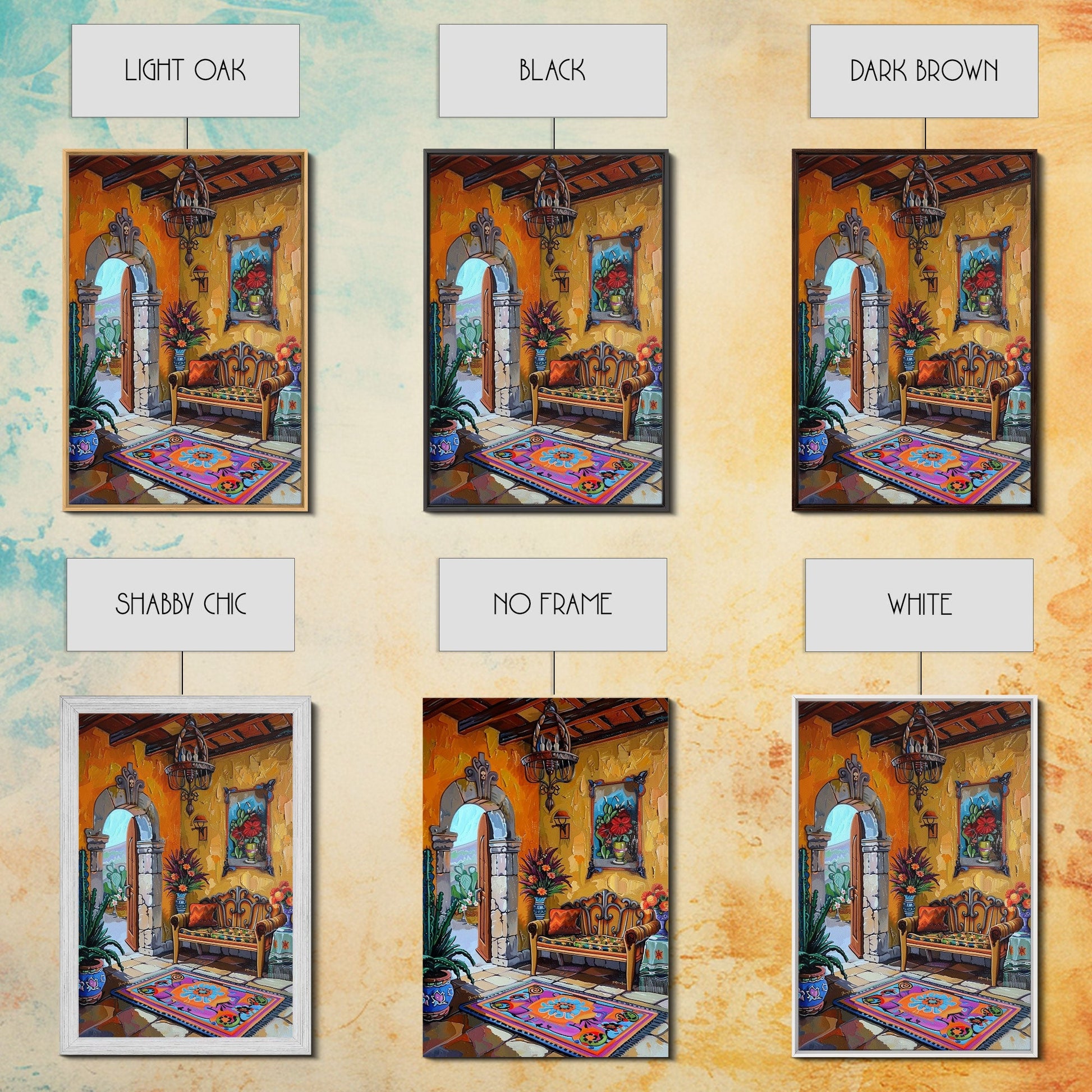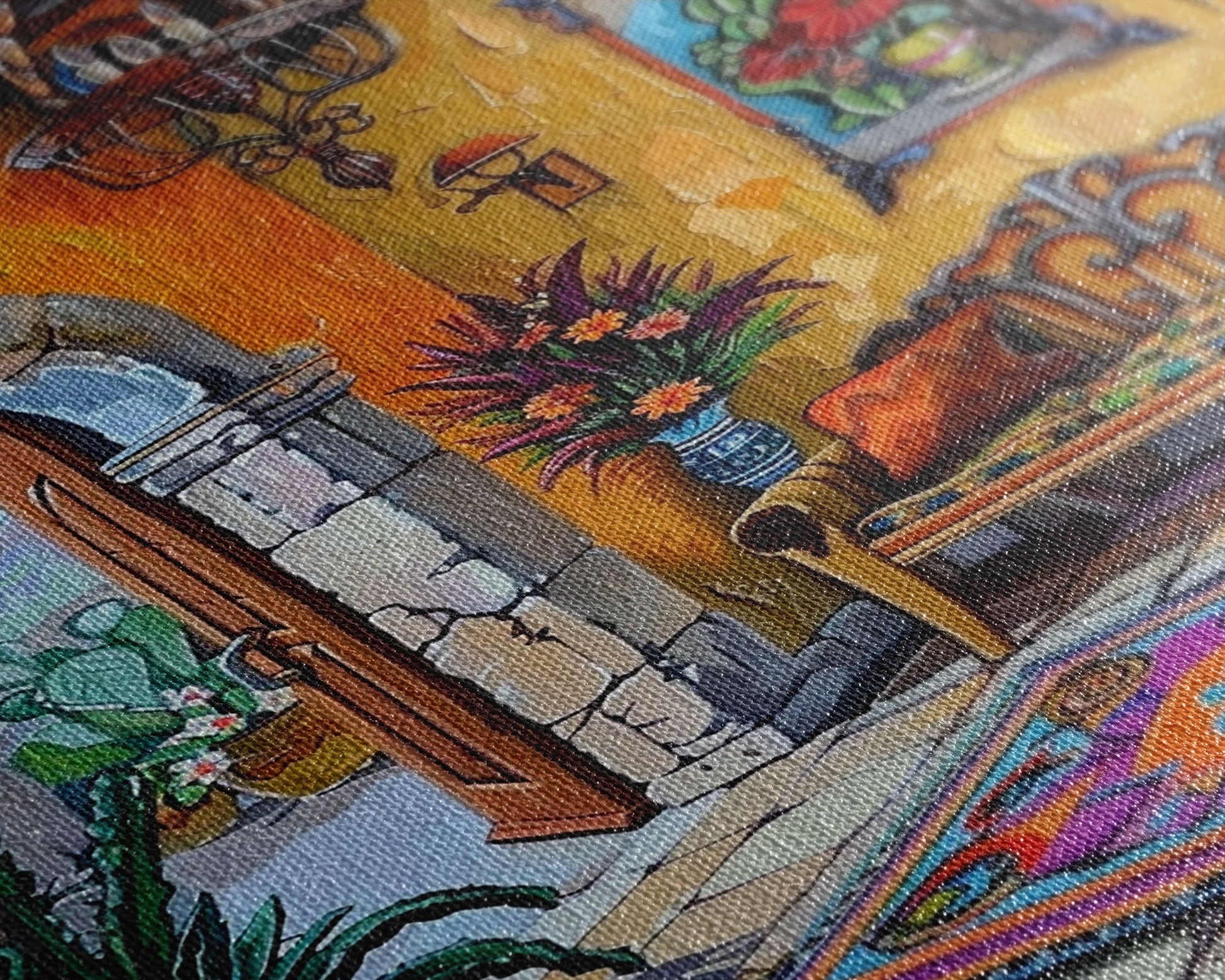 Vibrant Spanish Courtyard Framed Canvas Print Colorful Home Decor Best Gift Bright Seasonal Wall Art Mediterranean Patio Above Sofa Art