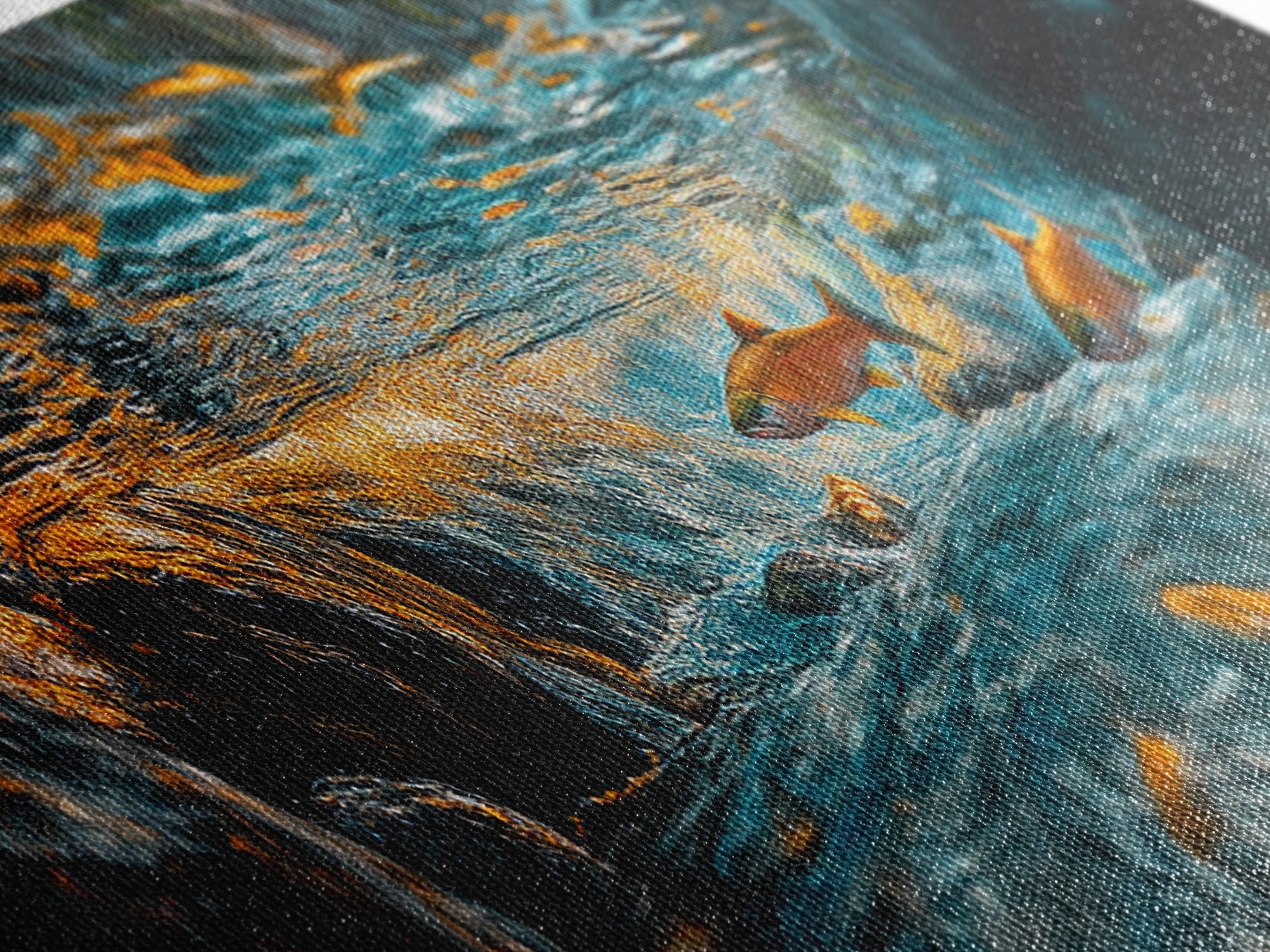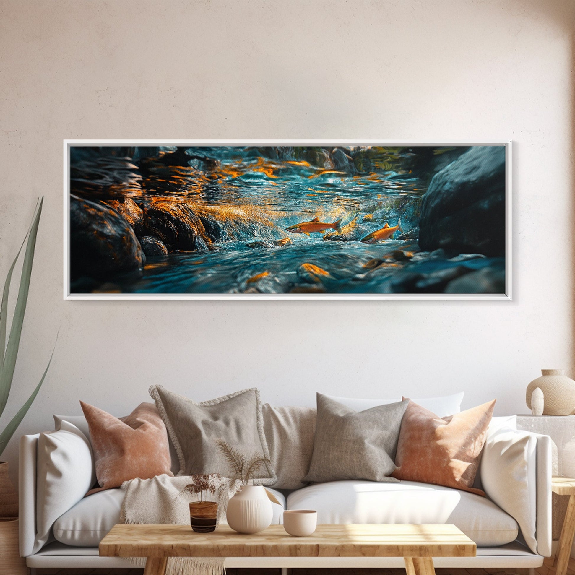 Vibrant Underwater River Scene Framed Canvas Print, Nature Wall Art, Rustic Cabin Decor, Wildlife Painting, Living Room Art