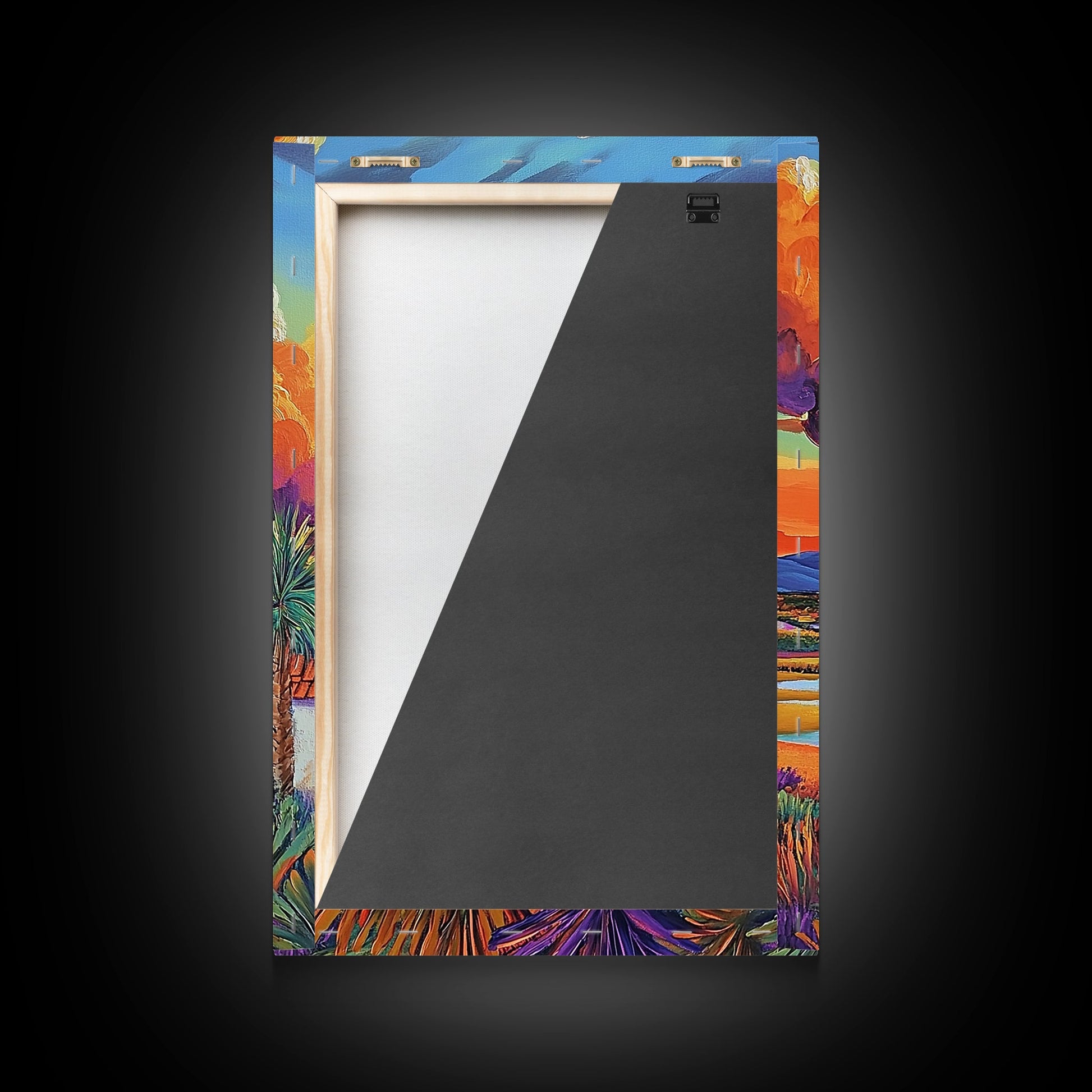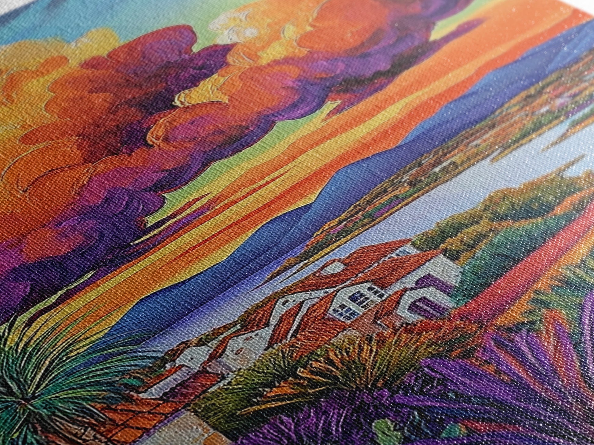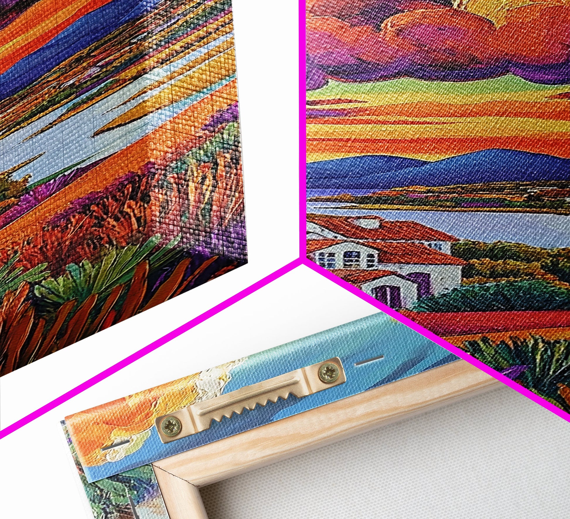 Village Sunset, Clouds, Landscape, Framed Canvas Print, Colorful Scenic Wall Art, Rustic Living Room Decor, Mediterranean Countryside
