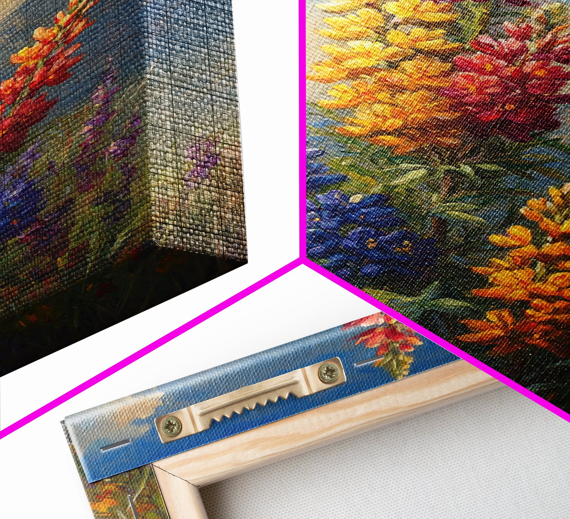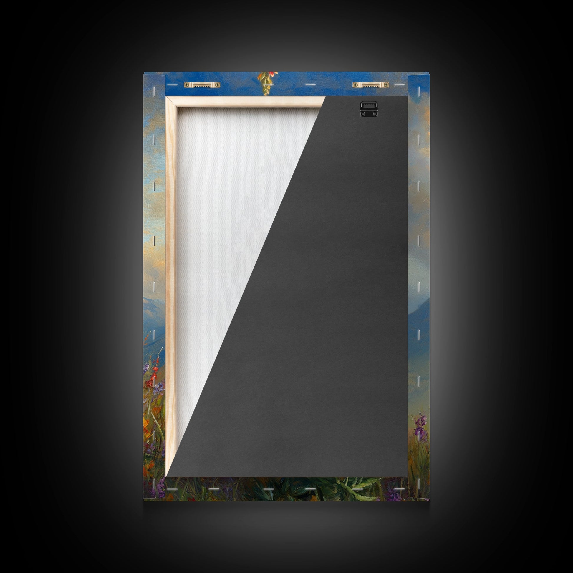 Vintage Style Canvas Print Oil Painting of Wild Flowers On A Mountain Landscape, Framed Canvas, Antique Style Wall Art, Painting of Flowers