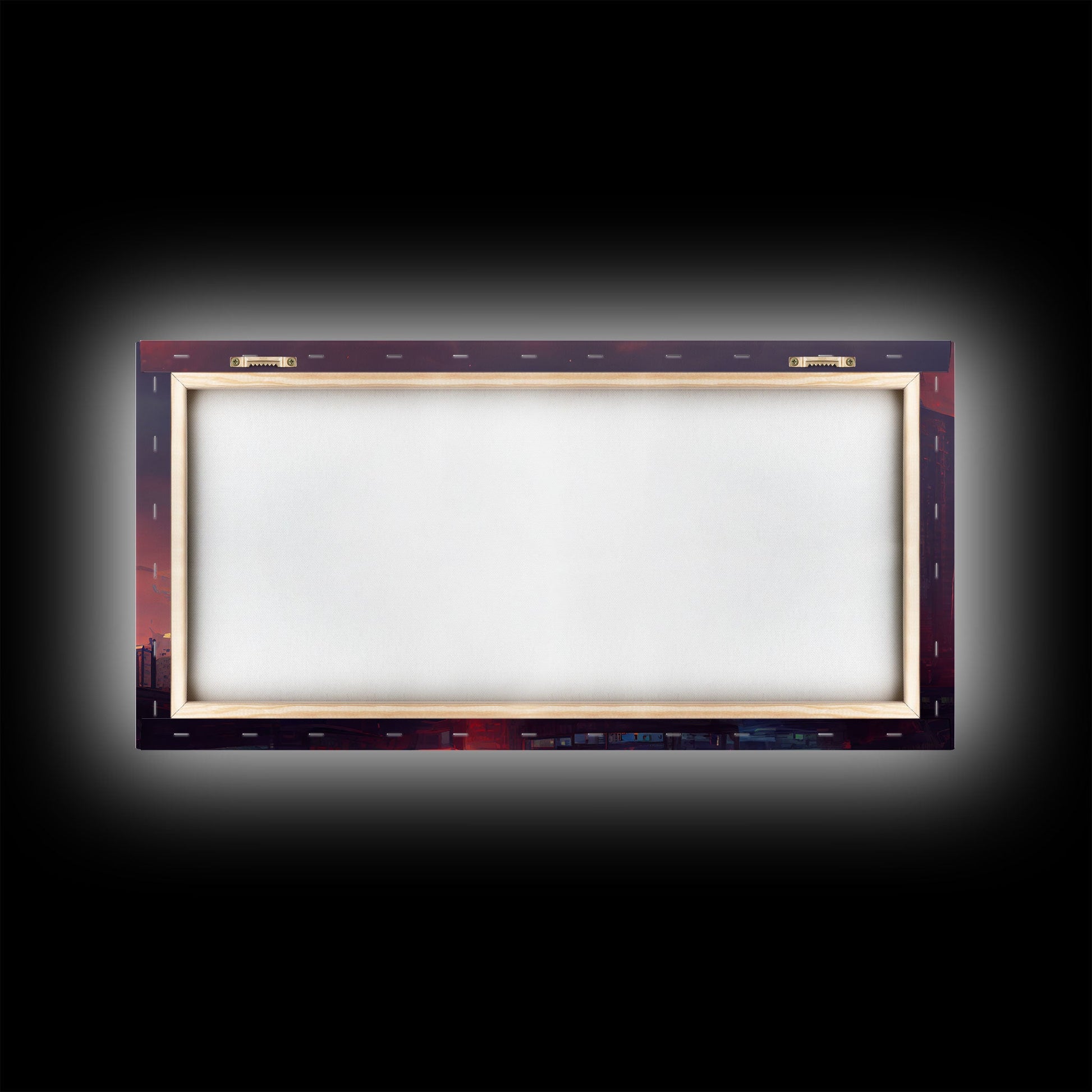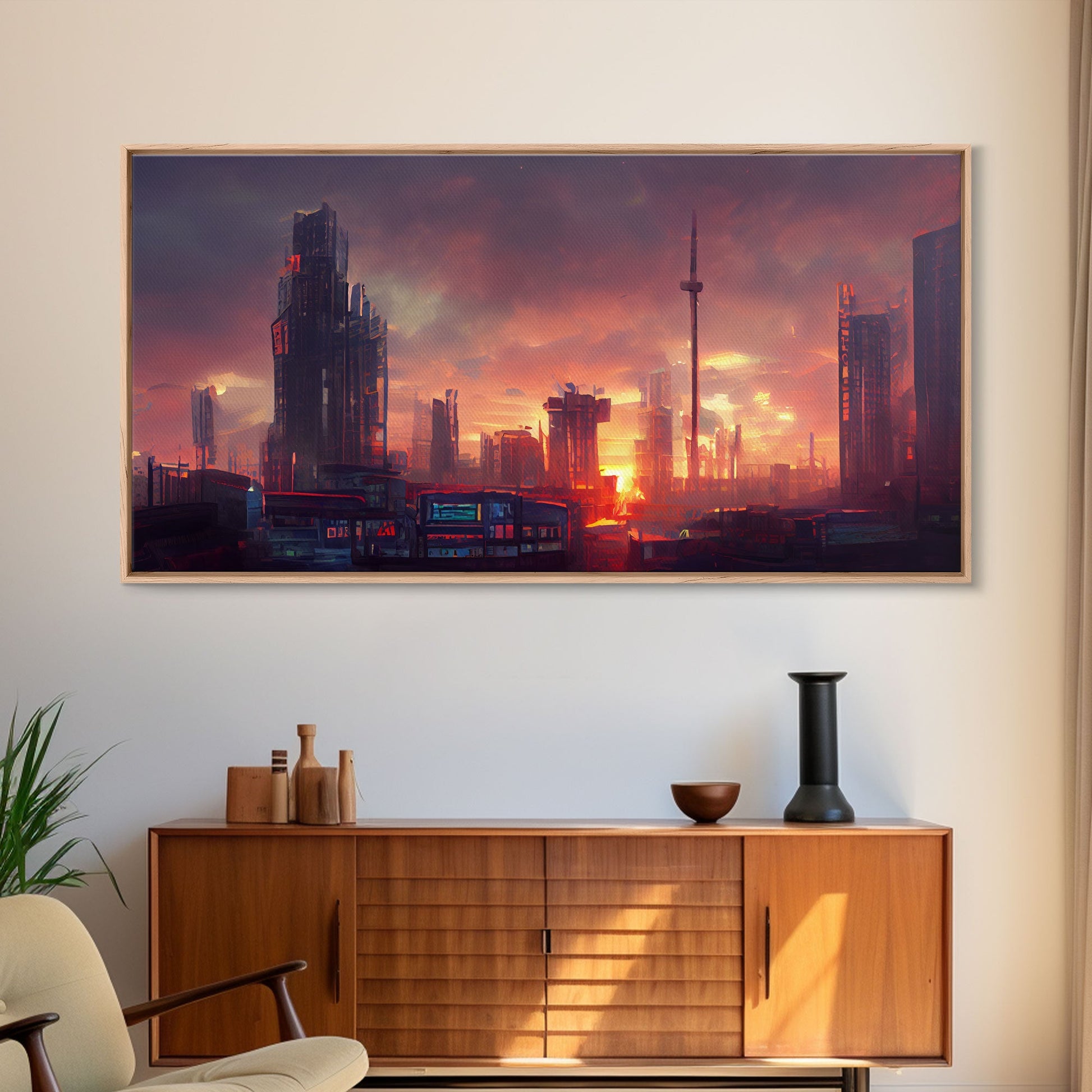 Watercolor of a cyberpunk city, canvas print, dystopian urban landscape at sunset, synthwave style