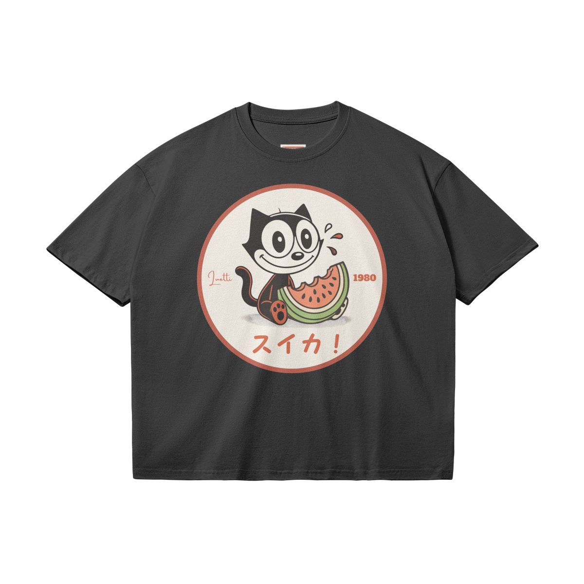 This vintage-inspired graphic tee features a cheeky cat enjoying a juicy slice of watermelon, with the word “WATERMELON!” boldly printed in Japanese. With its playful charm and vibrant colors, it’s perfect for those who want to show solidarity subtly—and in style.