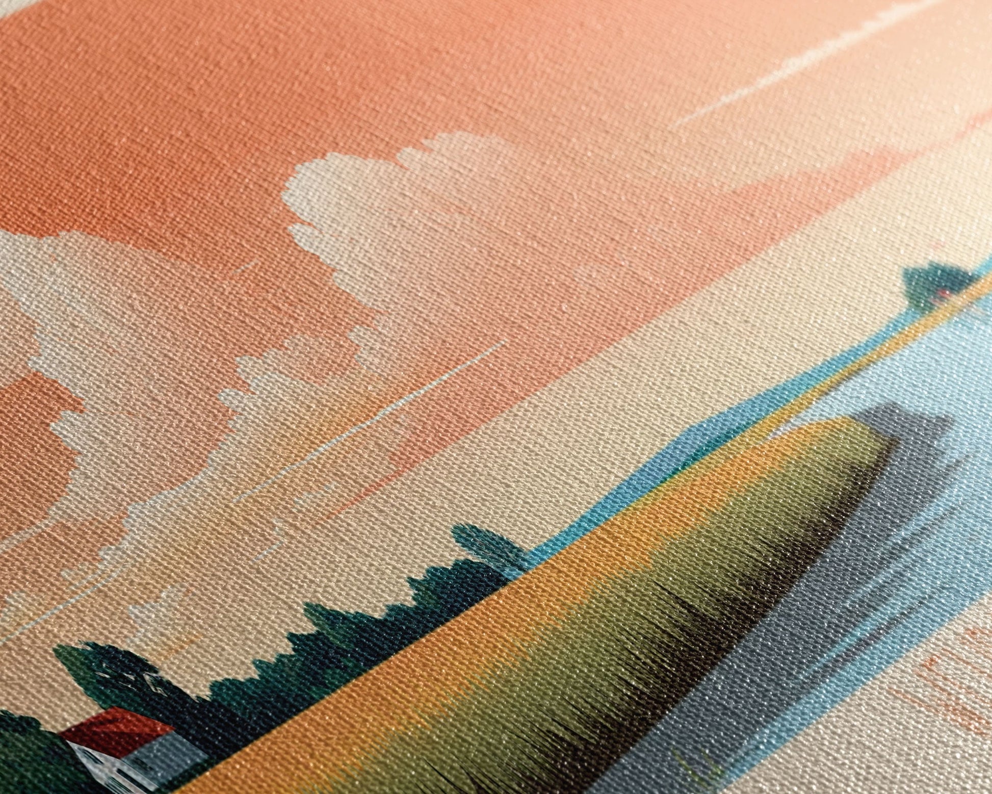 Most of our canvases are made in the USA, with the exception of canvases ordered with the light oak unstained frames, and any large canvases (24x48, 30x60, 16x48 and 20x60) ordered WITH a frame. These are temporarily made in and shipped from Europe, while we try to find a more consistent supplier in the USA.