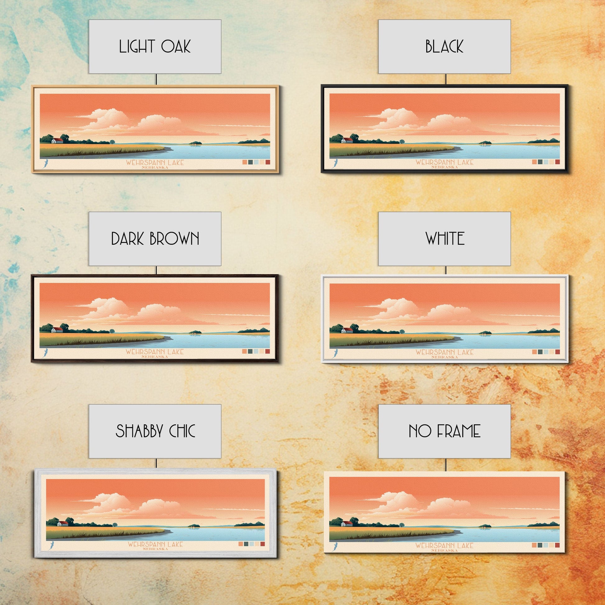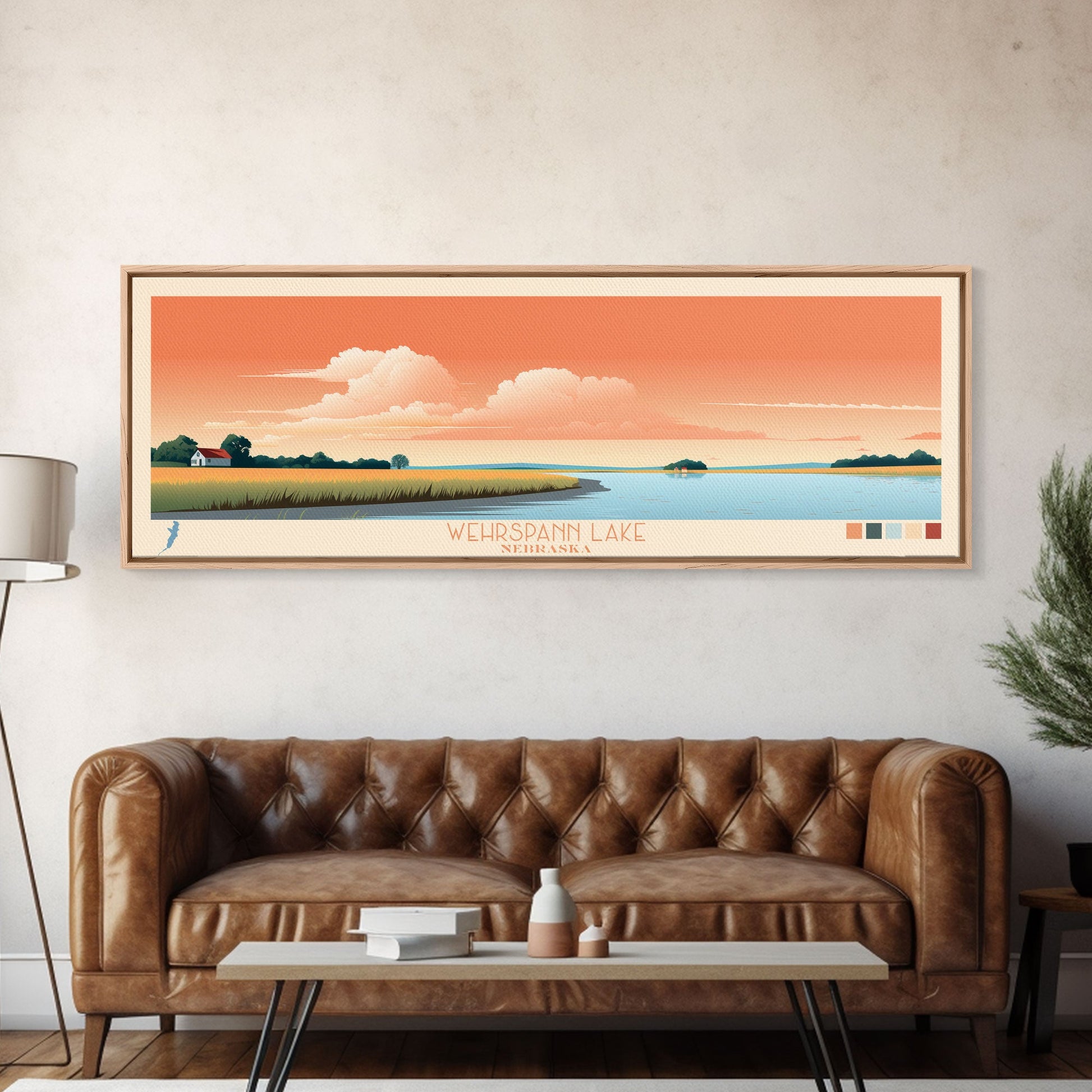 Wehrspann Lake, Nebraska Panoramic Framed Canvas Print, Midcentury Modern Art, Lake House Decor, Pop Art, Travel Poster, Bedroom Wall Art