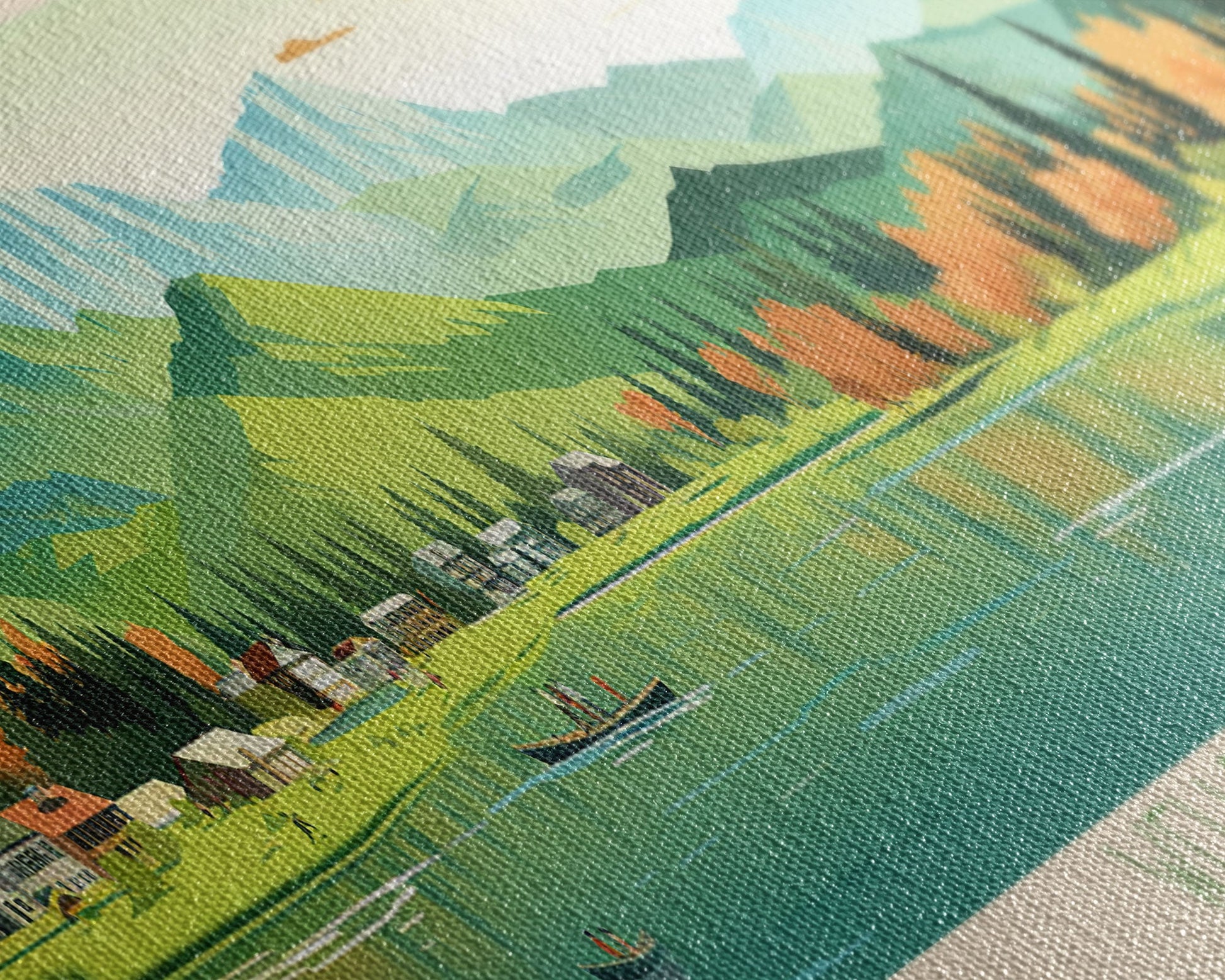 Most of our canvases are made in the USA, with the exception of canvases ordered with the light oak unstained frames, and any large canvases (24x48, 30x60, 16x48 and 20x60) ordered WITH a frame. These are temporarily made in and shipped from Europe, while we try to find a more consistent supplier in the USA.