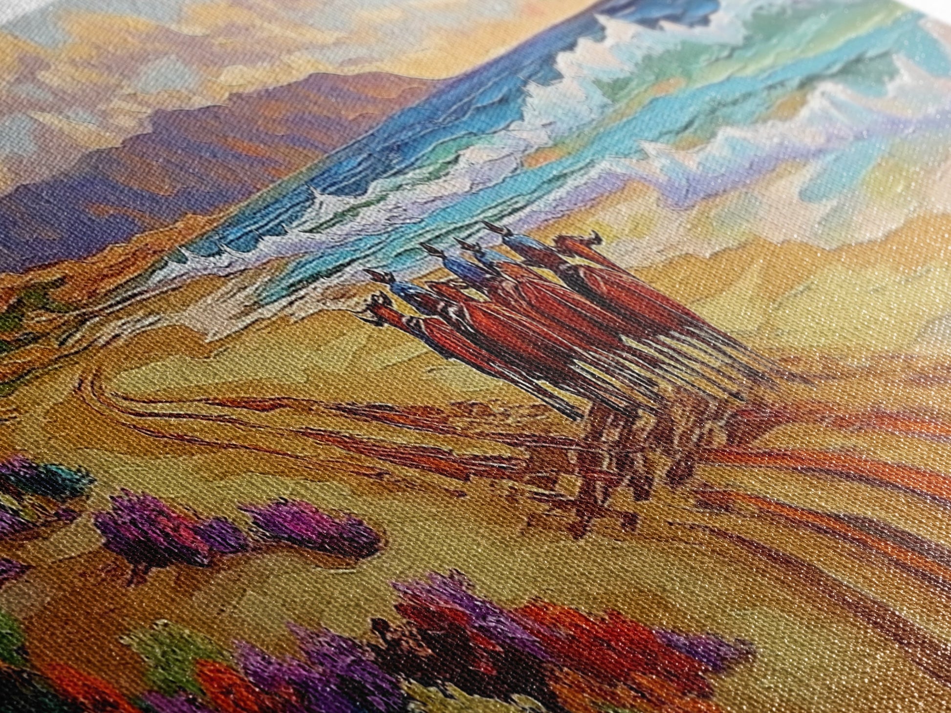 Most of our canvases are made in the USA, with the exception of canvases ordered with the light oak unstained frames, and any large canvases (24x48, 30x60, 16x48 and 20x60) ordered WITH a frame. These are temporarily made in and shipped from Europe, while we try to find a more consistent supplier in the USA.