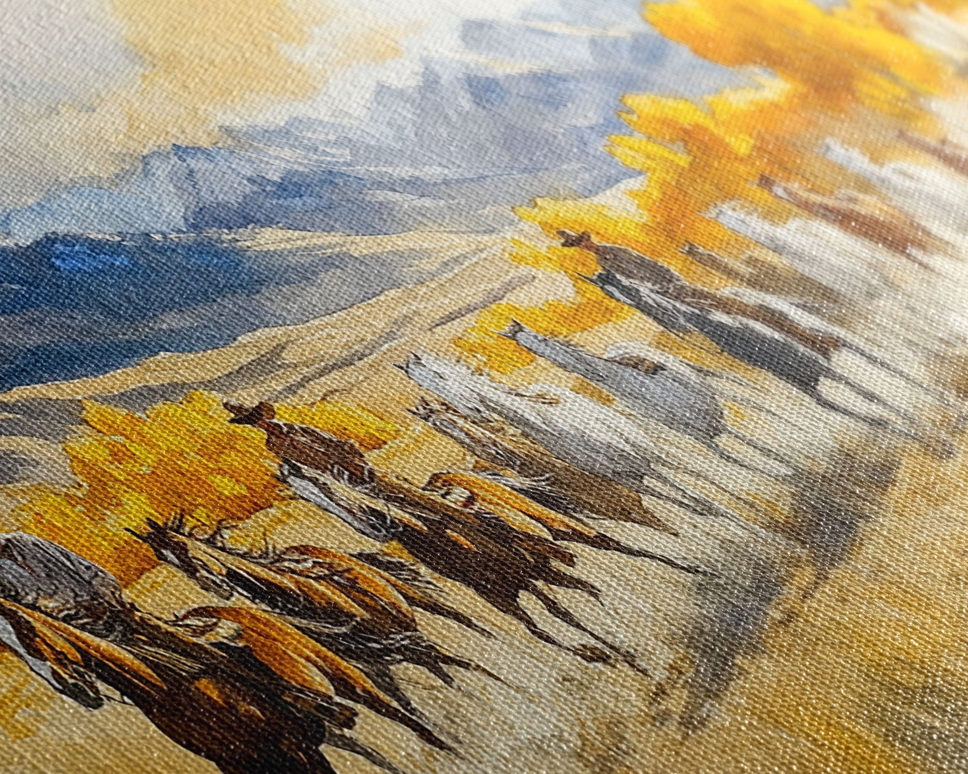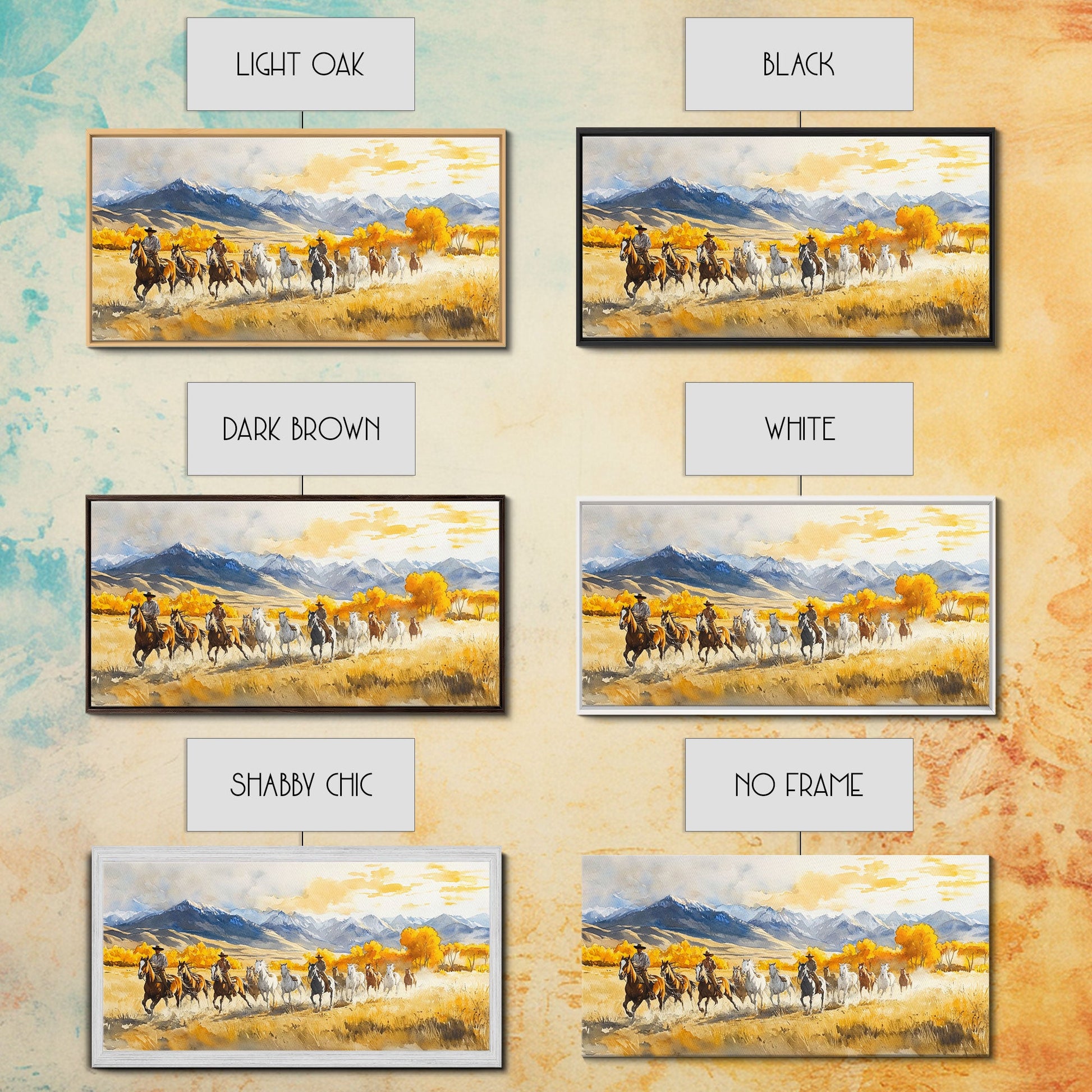 Western Cowboy Horse Drive Framed Canvas Print, Autumn Mountain Landscape with Riders and Horses in Golden Fall Light Wall Art