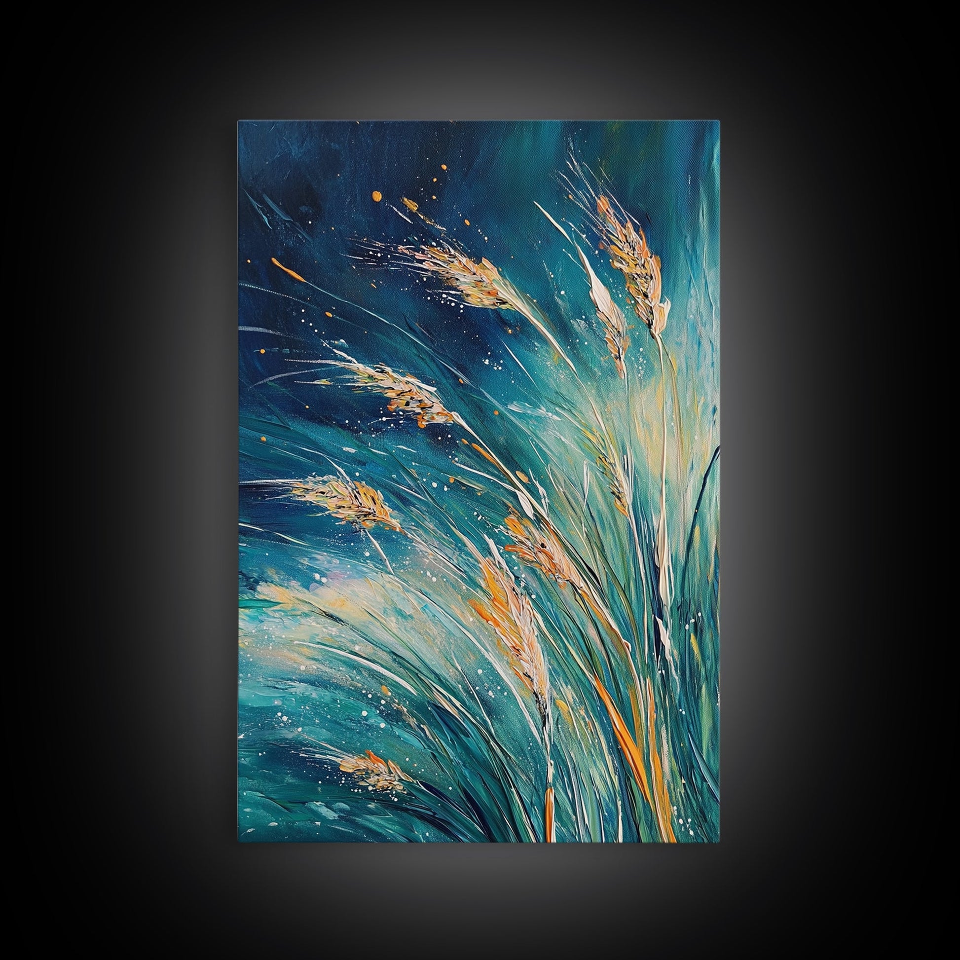 Wheat Fields Framed Canvas Print Rustic Farmhouse Wall Art, Deep Blue Abstract Painting, Autumn Home Decor, Cozy Country Living