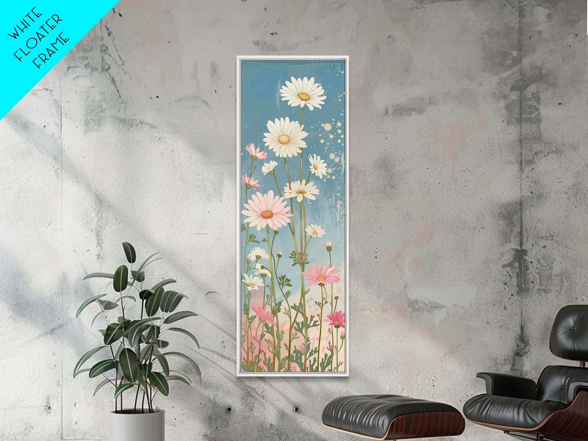 White Daisies Blossoms Japanese Tall Wall Art Blue Background Skinny Framed Canvas Print Ukiyo-e Style