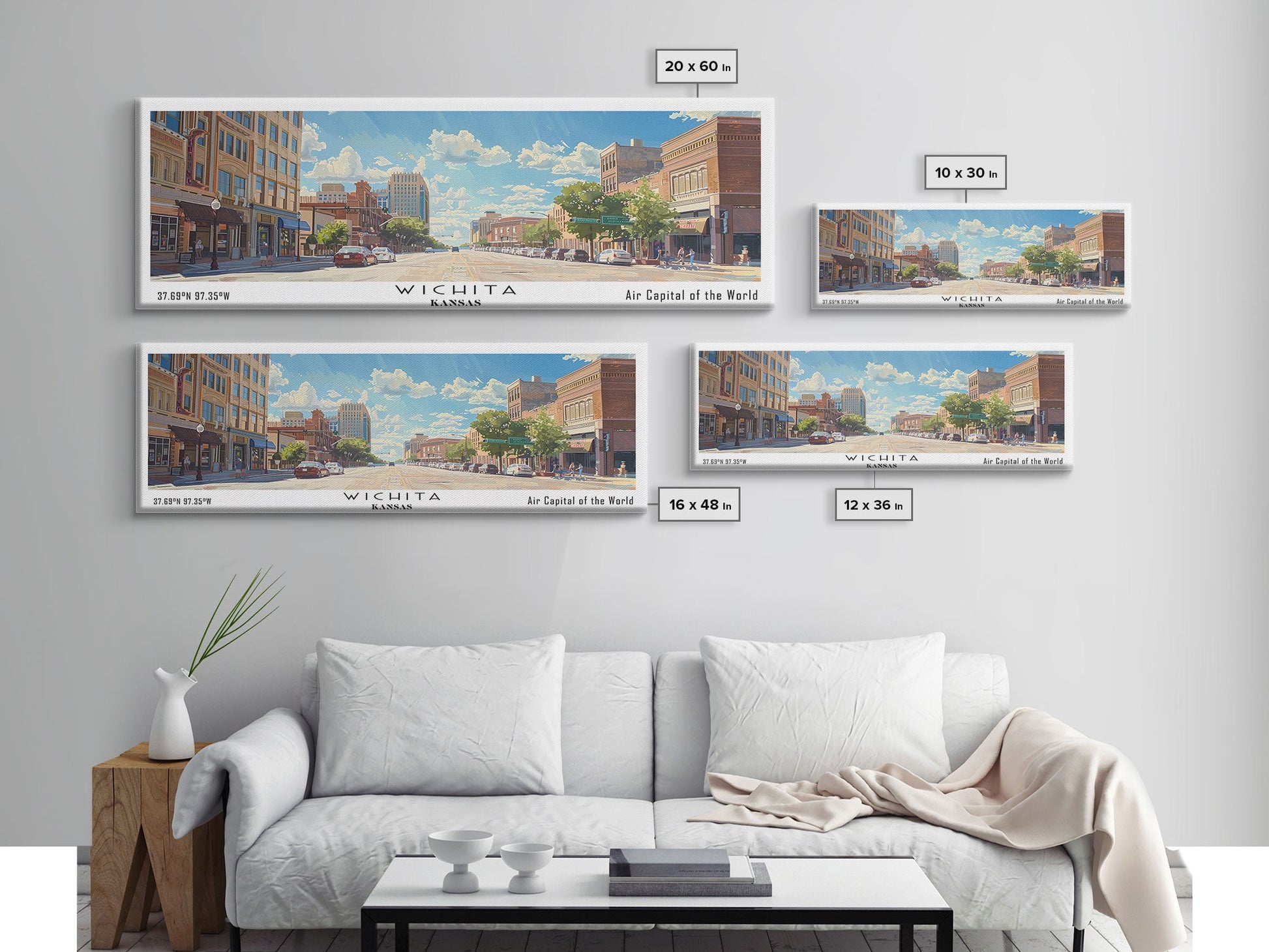 Wichita Kansas Panoramic Framed Canvas Print, Retro Travel Poster, Artistic Wall Art, Unique Living Room Decor, Office Gift, Original Artwork