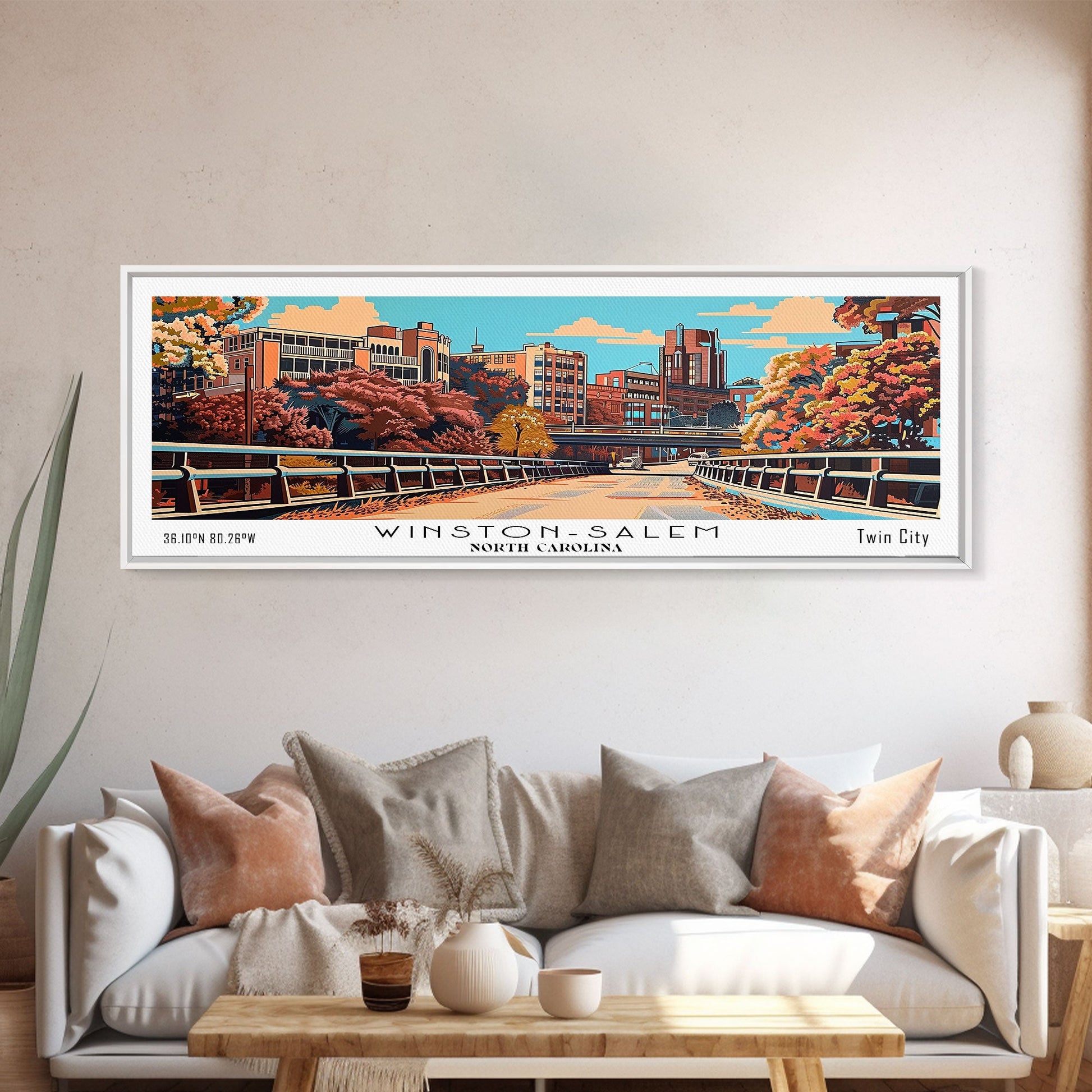 Winston-Salem North Carolina Panoramic Wall Art, Mid Century Modern Framed Canvas Print, Retro Pop Art Travel Poster, Cityscape Decor, Office Wall Art