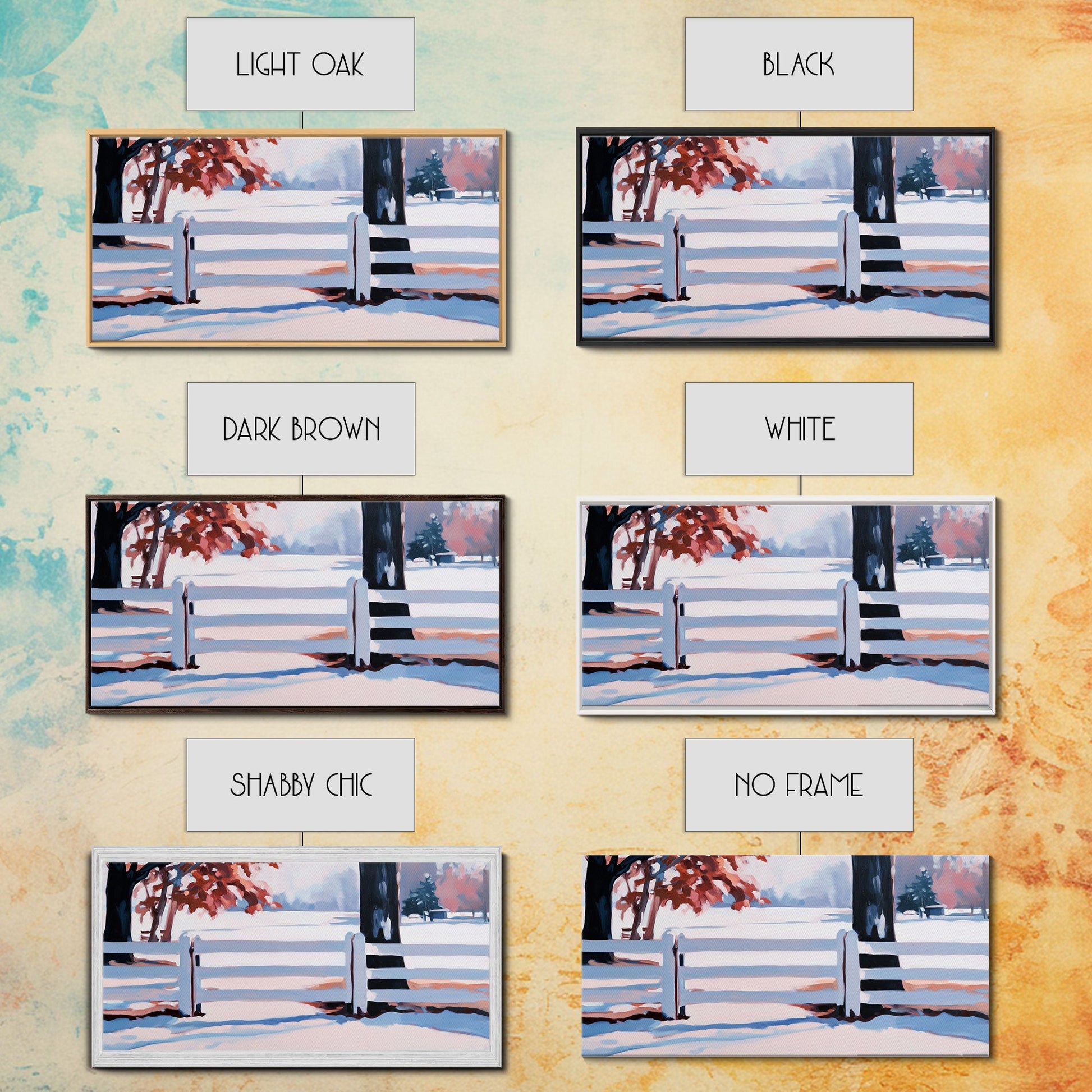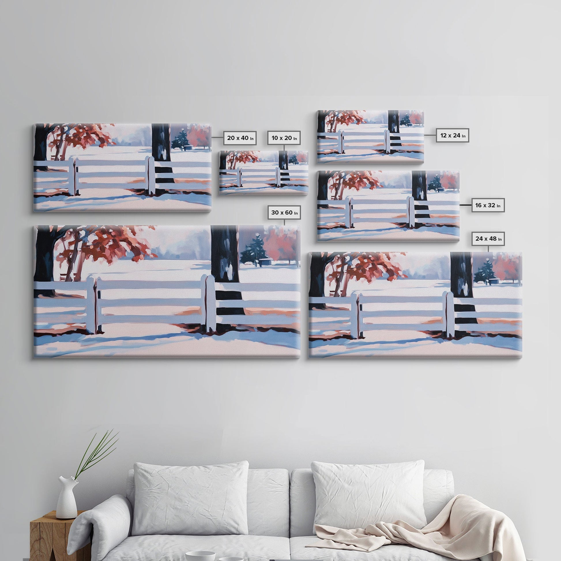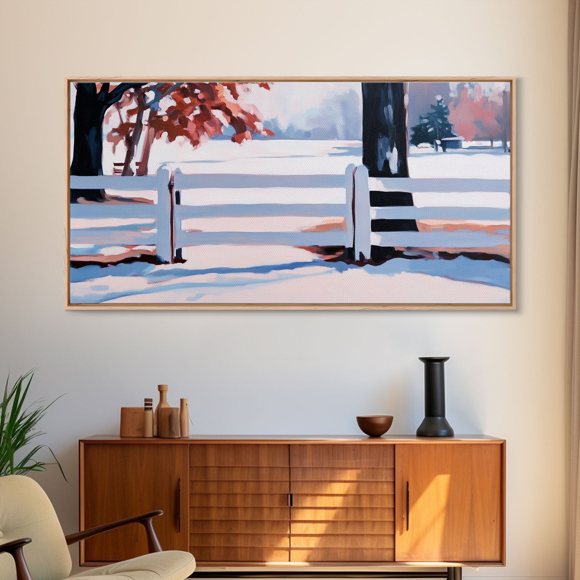 Winter Landscape Framed Canvas Print, Moody Landscape Wall Art, Snowy Trees and Fence Scene, Christmas Home Decor, Seasonal Winter Wall Art