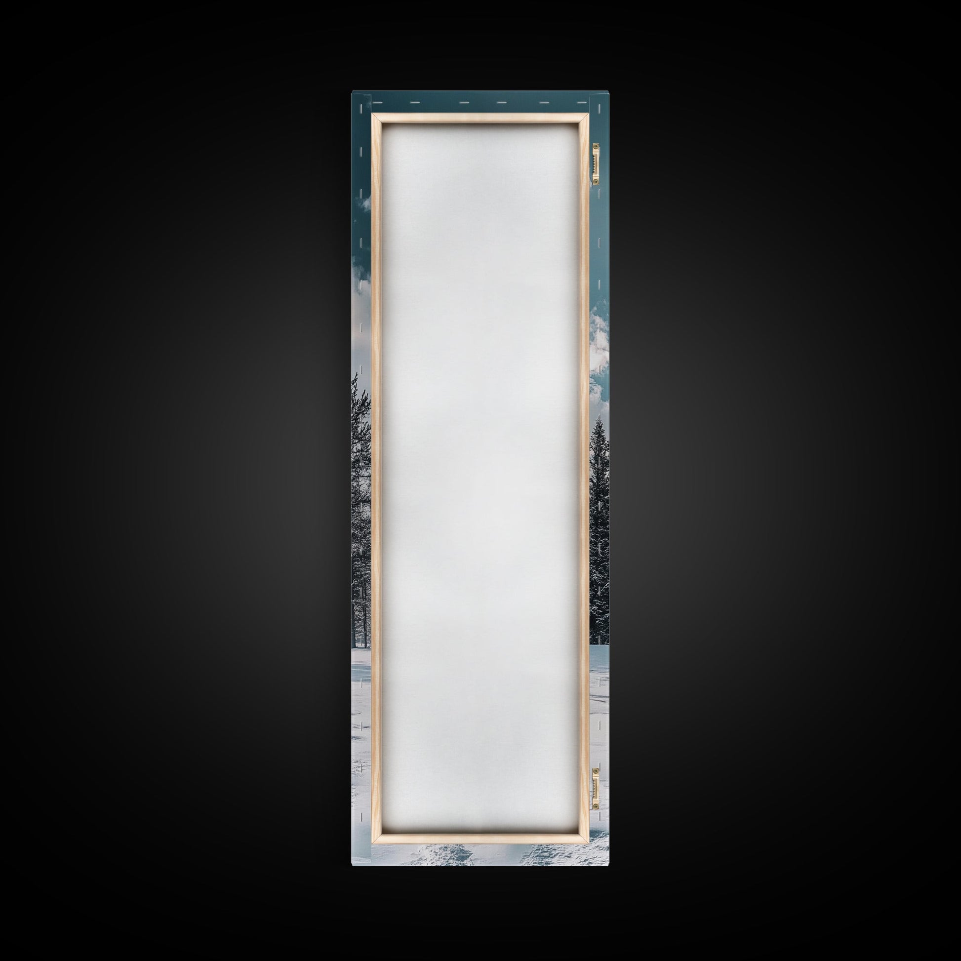 Winter Path, pine tree art, mountain painting, snowy landscape, rustic decor, minimalist art, Framed Canvas Print, vertical wall art