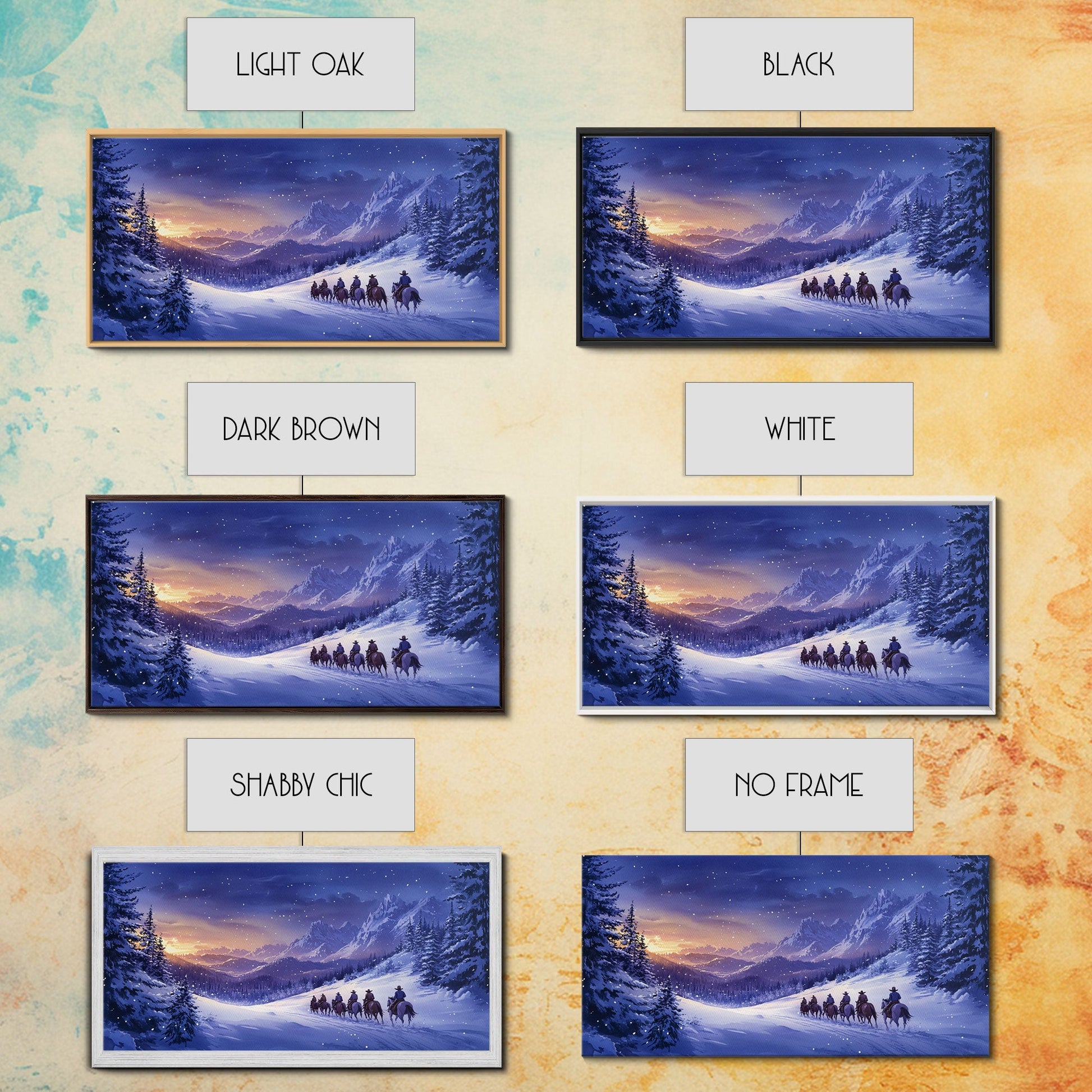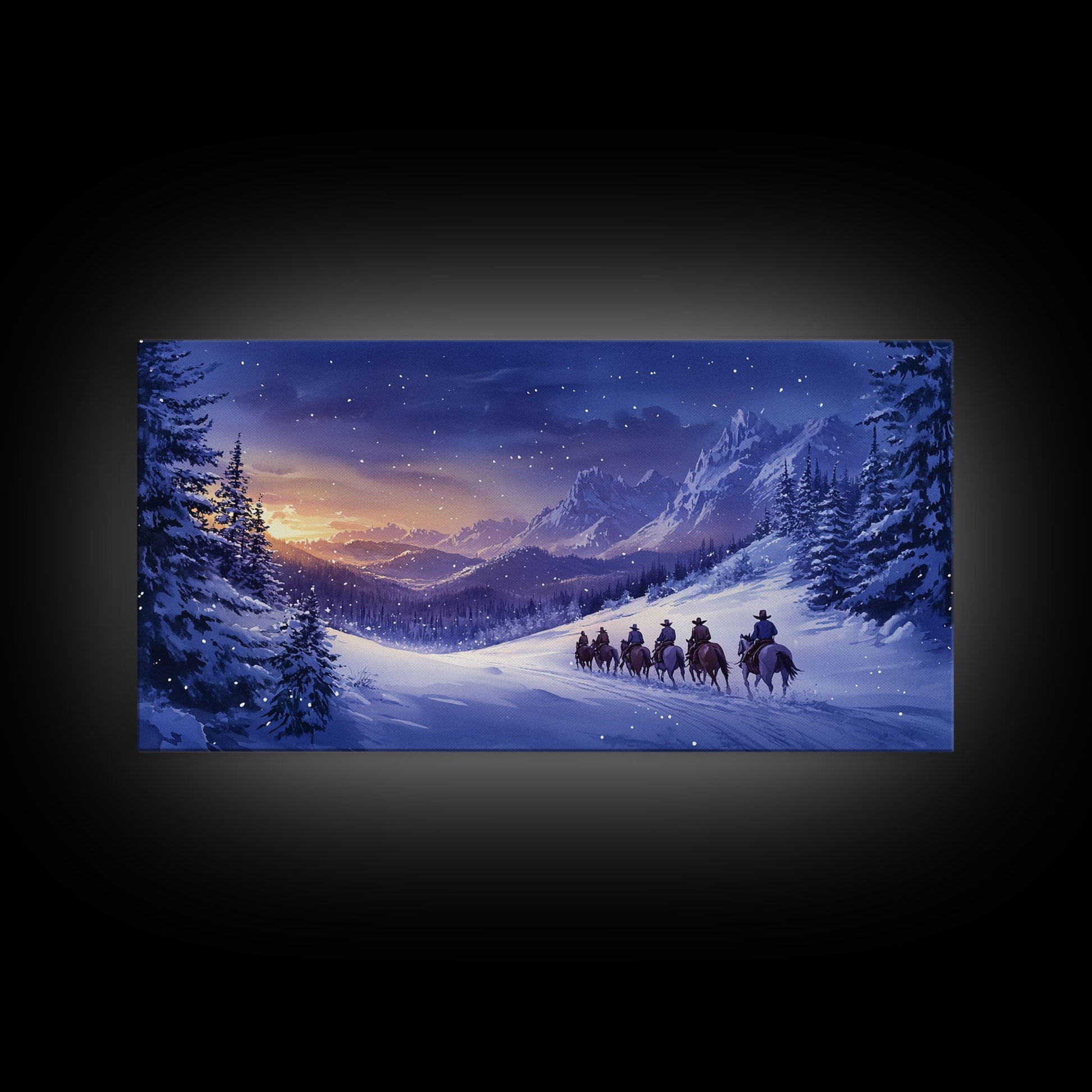 Winter Wonderland Cowboy Canvas Print, Snowy Mountain Landscape Art, Rustic Christmas Decor, and Holiday Western Themed Wall Art
