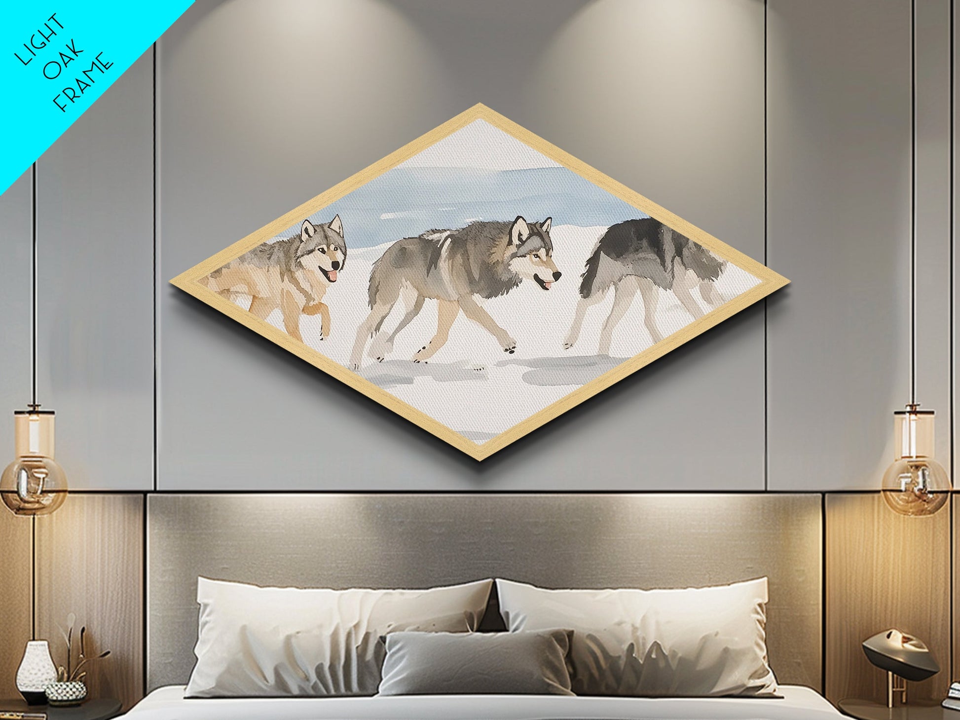 Wolf Pack In The Snow, Framed Canvas Print, Beautiful Watercolor Painting Of Wolves, Canvas Art Print, Diamond Shaped Art