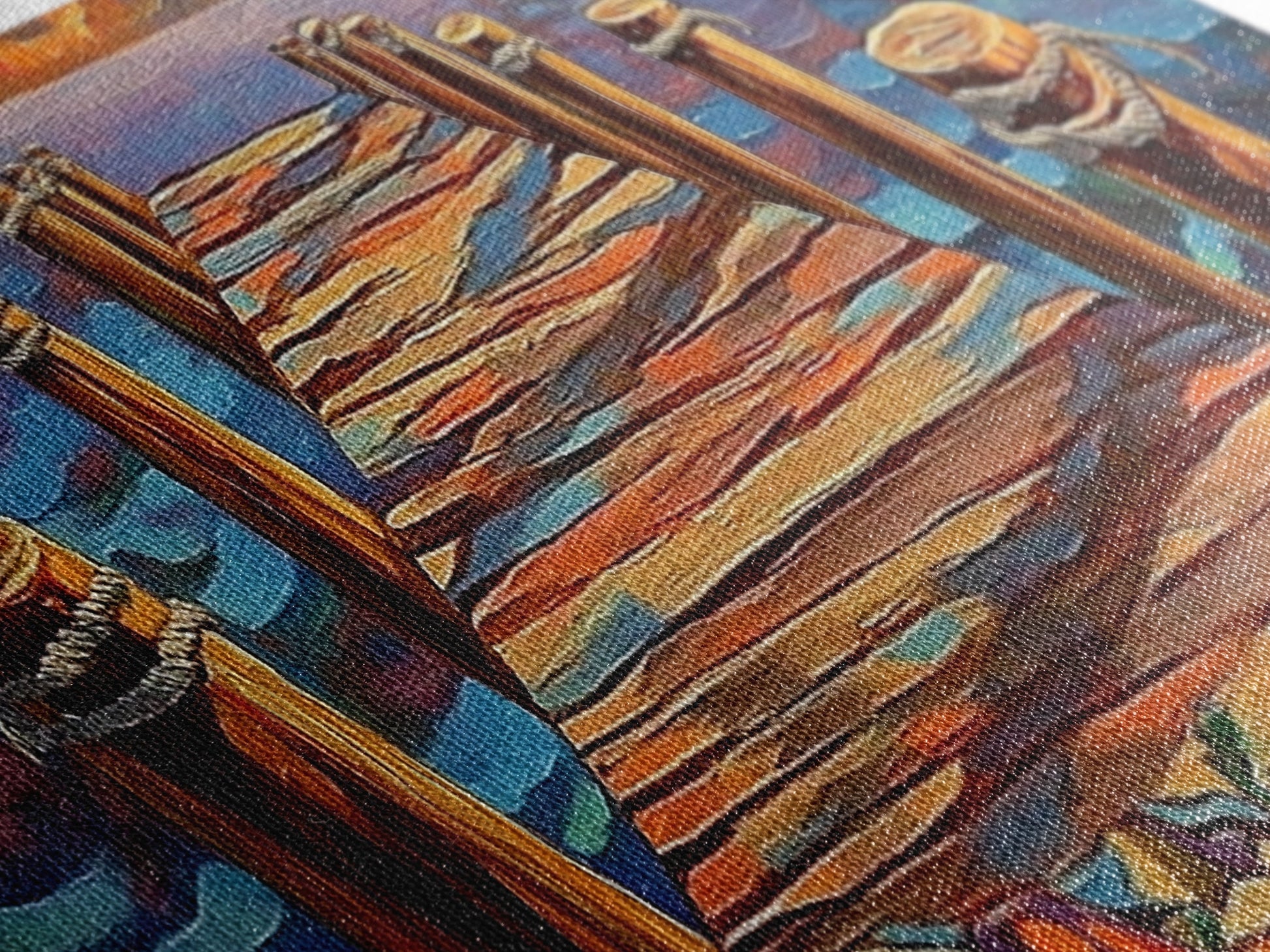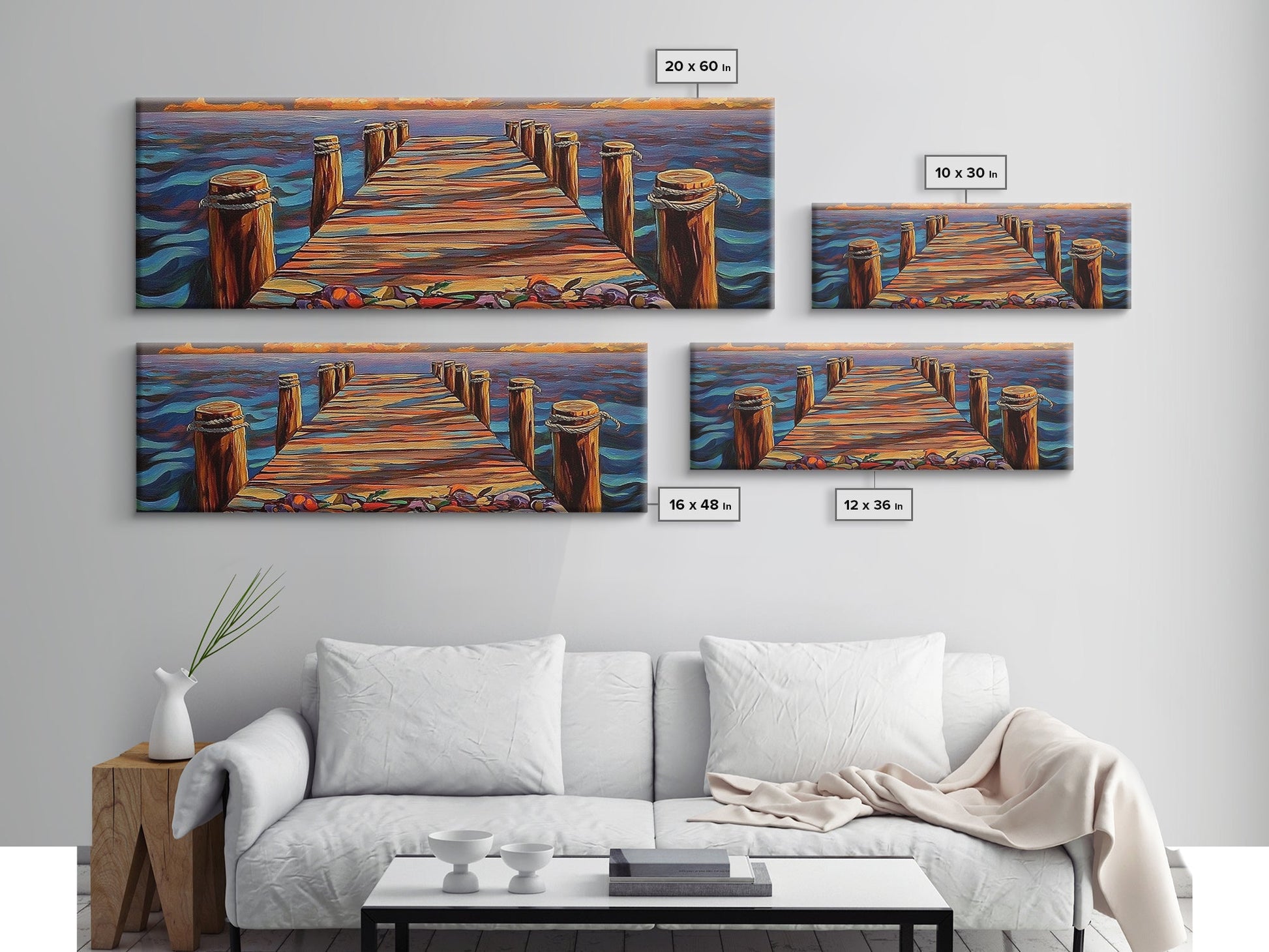 Wooden Dock Sunset, Ocean Pier Painting, Tranquil Seascape Decor, Nautical Beach House Style, Framed Canvas Print