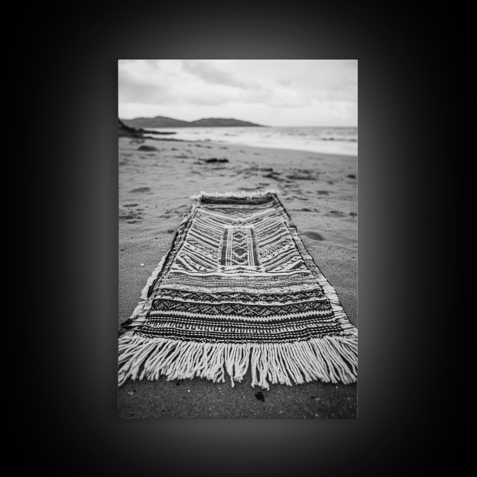 Woven Rug Beach, Bohemian Escape, Textile Texture, Black and White Canvas Print, Boho Bedroom or Yoga Studio Wall Decor